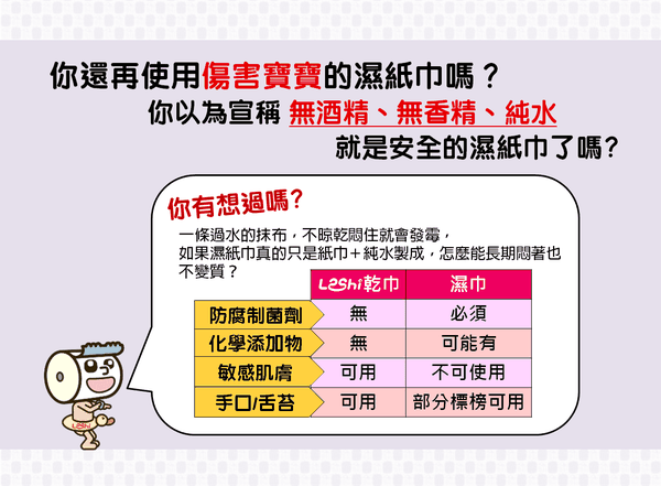 就算是標榜超純水的柔濕巾,打開沒有馬上用完,細菌還是會附著污染 (´◓Д◔`) 此外,濕紙巾的棉絮,對寶寶細緻的肌膚也是一大刺激傷害。