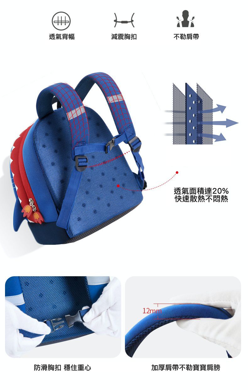 肩帶附有胸扣設計,方便將書包固定在小小孩身上,不擔心跑跳時書包滑落