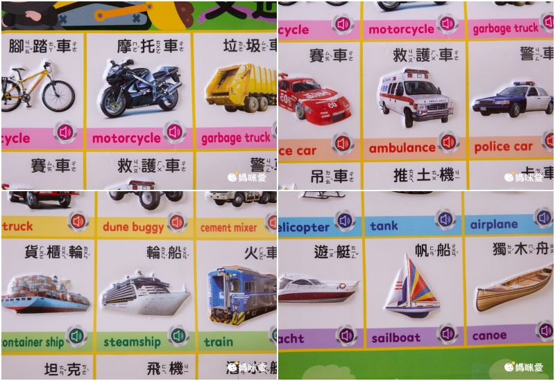 這款絕對就是家有車車迷必備啦!一次學到36種中英台3語的單字,換算下來簡單一張掛圖就能學108個字詞,是不是很划算!