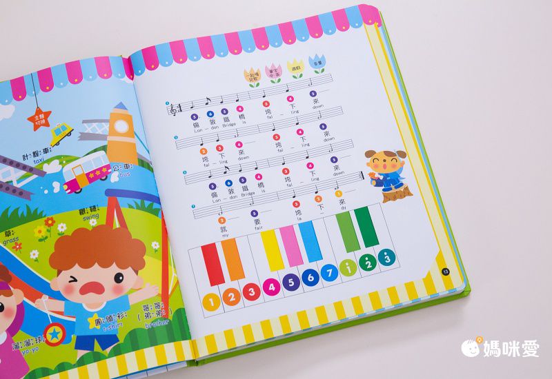 就算不會看五線譜也沒關係喔!只要會「認顏色」就可以,找到同樣顏色的按鍵輕輕一按,就能彈出一首歌啦~