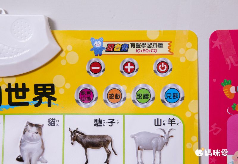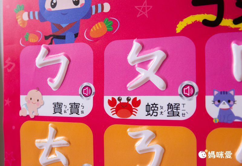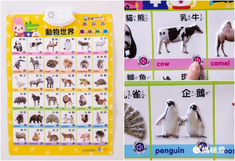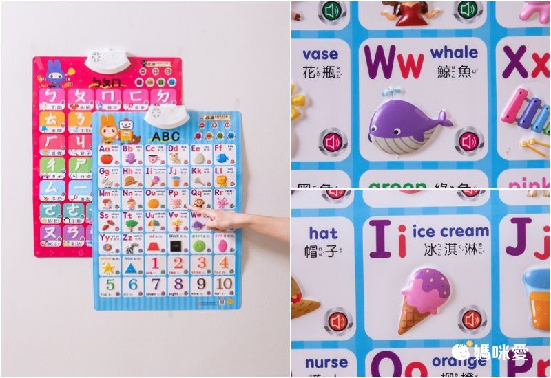 玩法超簡單,保證教一次孩子就會了:找到掛圖上的喇叭符號,輕輕按一下就能聽到ㄅㄆㄇ、英文字母/單字、或者小動物的正確念法囉!