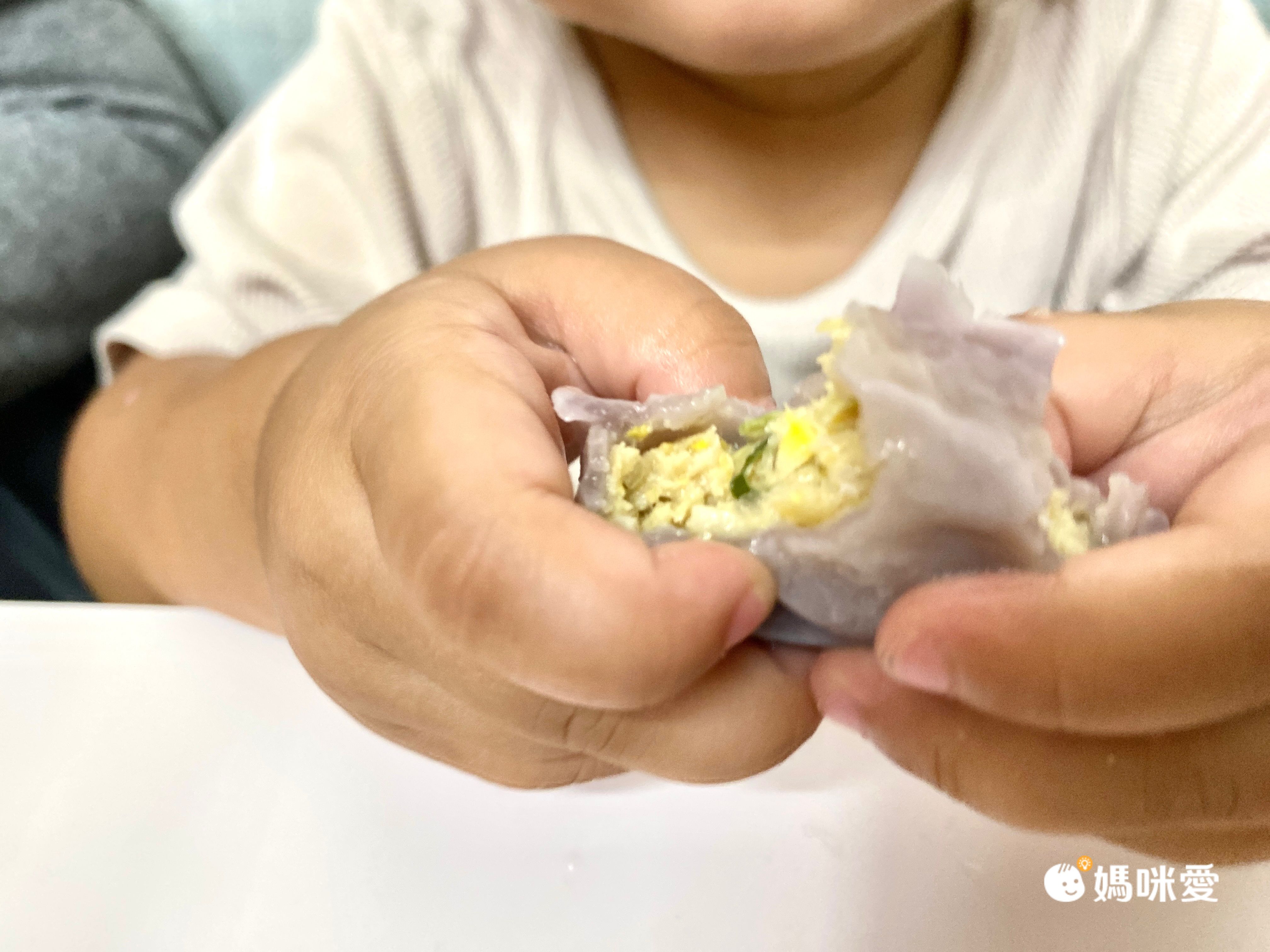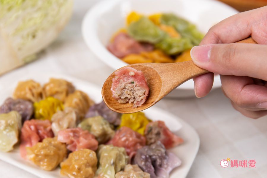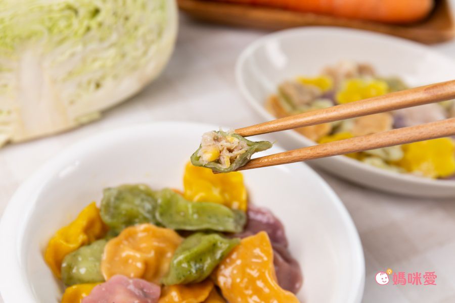 彩色的皮煮好後看起來是不是很可口呢~大小也是寶寶一口就可以吃的程度呦~吞嚥能力沒有那麼好的寶寶可以使用食物剪處理。不過要注意,因為彩色餛飩也是給1歲以上幼兒吃的,所以也有微調味喔!內餡部分也是滿滿滿,不會是因為寶寶吃的餡料就很少。口味是大人也可以接受的~編媽和同事都覺得很好吃呢!