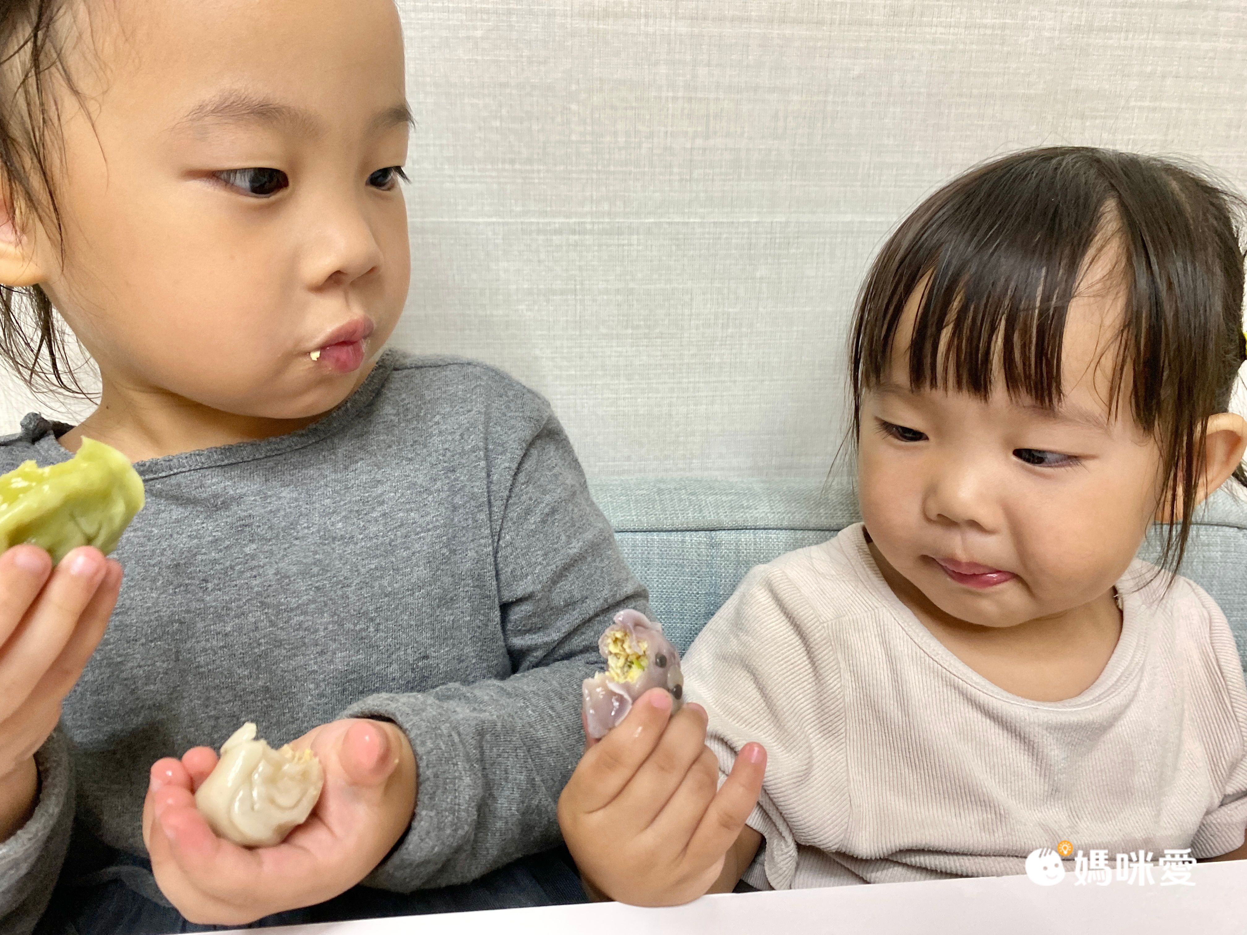不添加味精、色素跟防腐劑,一定是必備條件,這款水餃皮和童心好食館最經典的No.1花花水餃一樣(往後滑也有花花水餃的開箱唷)都是使用最天然的蔬果製成!不是人工色素,內餡則是高麗菜玉米豬肉,都是帶著自然甜味的蔬菜,雖然平常已經給姊妹倆吃大人吃的水餃,不過這款調味他們都很能接受,看她們搶食成這樣就知道了xD 完全是抓著不放~