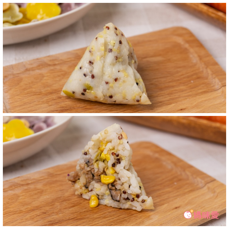 甜粽的紫地瓜泥、南瓜泥寶寶好咀嚼;鹹粽則是用紅蔥頭爆香的香菇肉燥加上些許寶寶薄鹽上味,內餡是新鮮毛豆仁與玉米碎,造型非常吸睛,真的是很好地運用了天然食材的顏色呢,一旁的同事都驚呼怎麼有這麼可愛的粽子~( 建議媽媽們要滾水煮一小時,米粒才會完全軟化,寶寶也比較好咀嚼喔!)