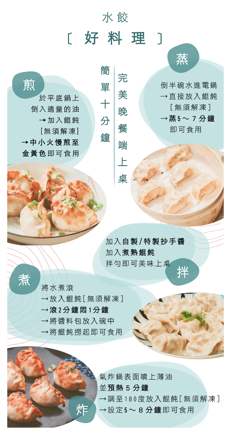 | 花菇高麗菜鮮肉水餃 | 高麗菜鮮肉水餃 | 韭菜鮮肉水餃 |