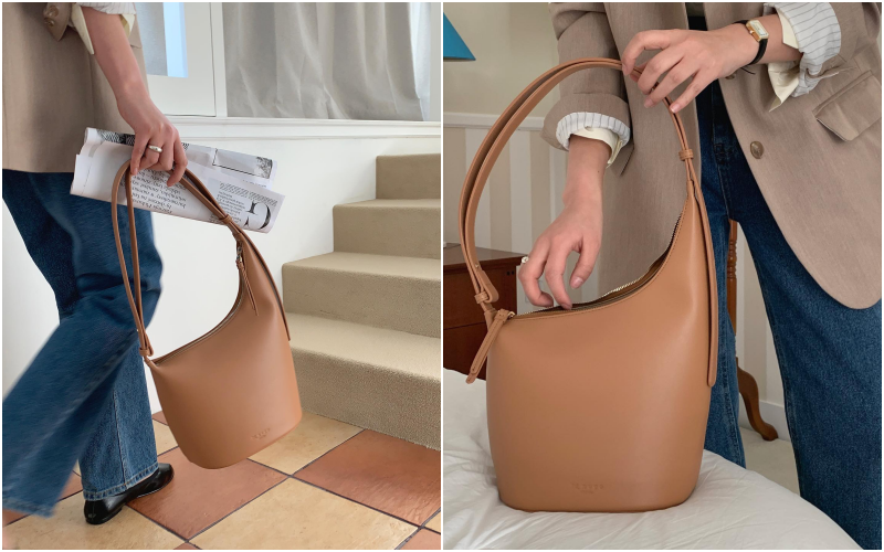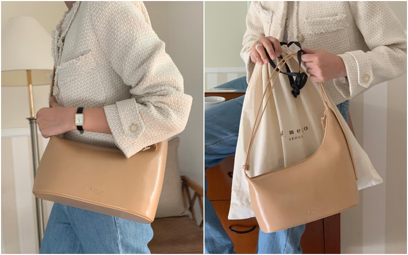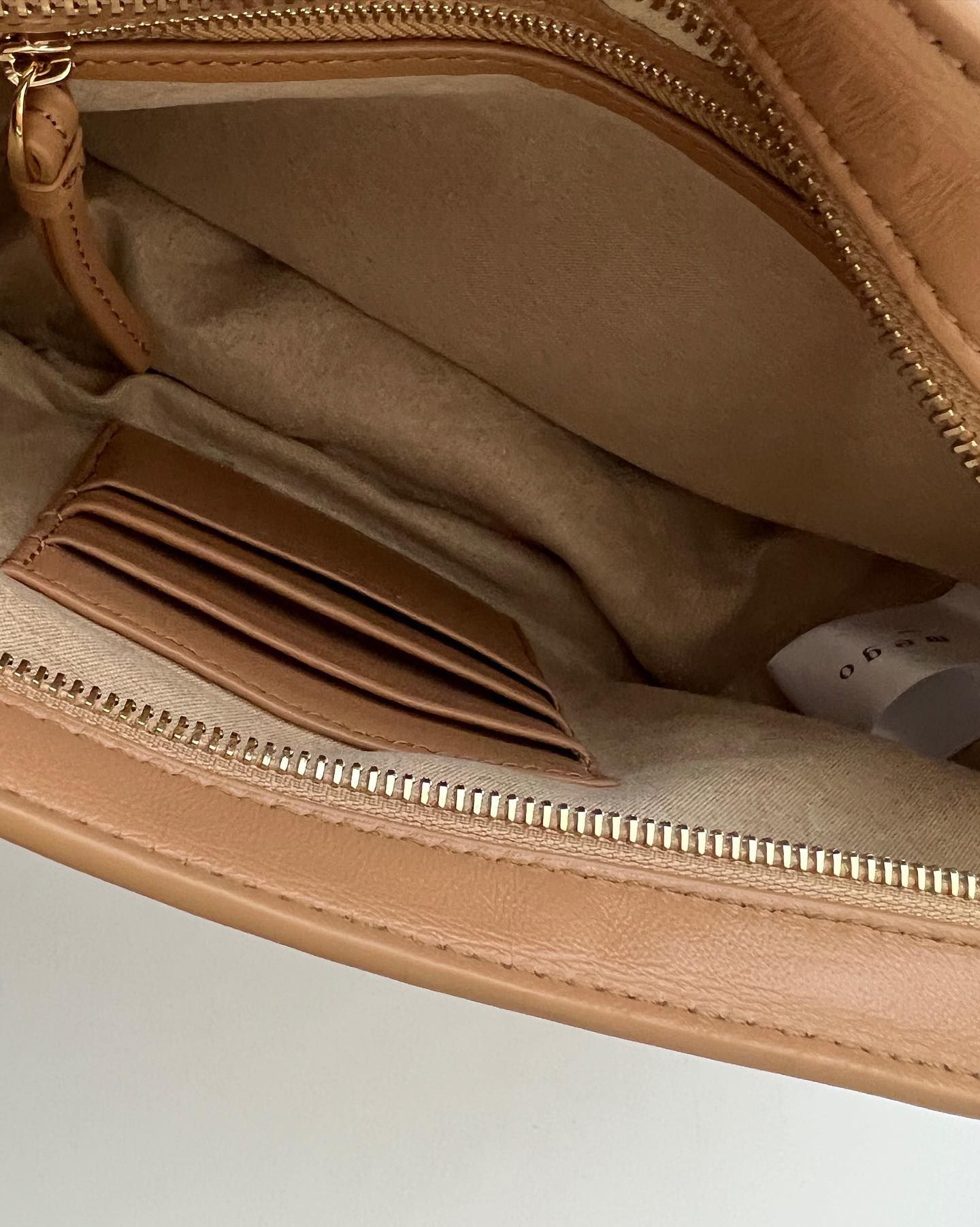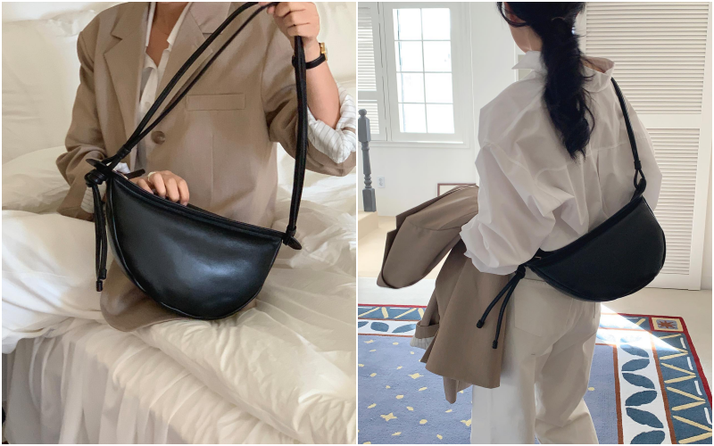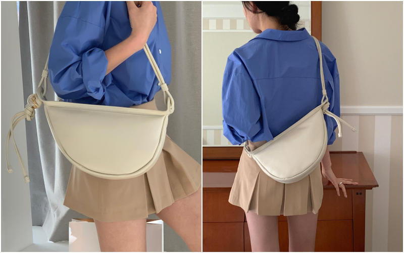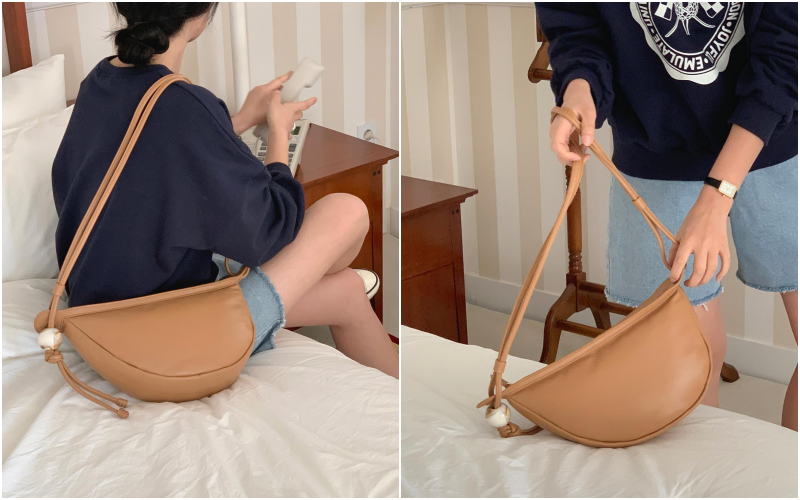 這款是的造型是近期很夯的半月型!而且100%羊皮製成,觸感非常柔軟!裝入手機、錢包、鑰匙後,再放其他小物也是綽綽有餘~