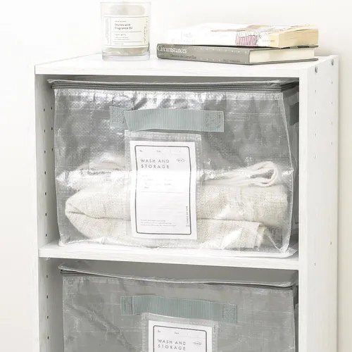 收好衣物後可以將收納箱放入櫃子中,或是放在衣櫃的隔板上方。