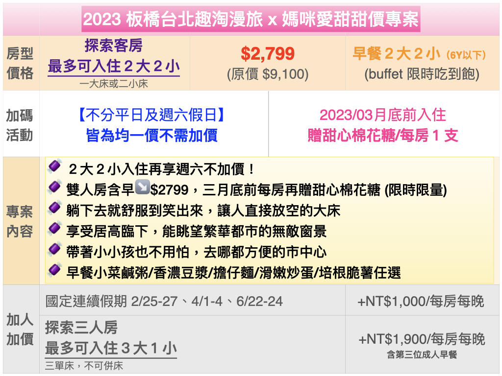 註 2:本專案除上述探索客房(雙人最多可入住 2 大 2 小、三人最多可入住 3 大 1 小)且無再提供加人加床服務;亦無其他房型之配合。