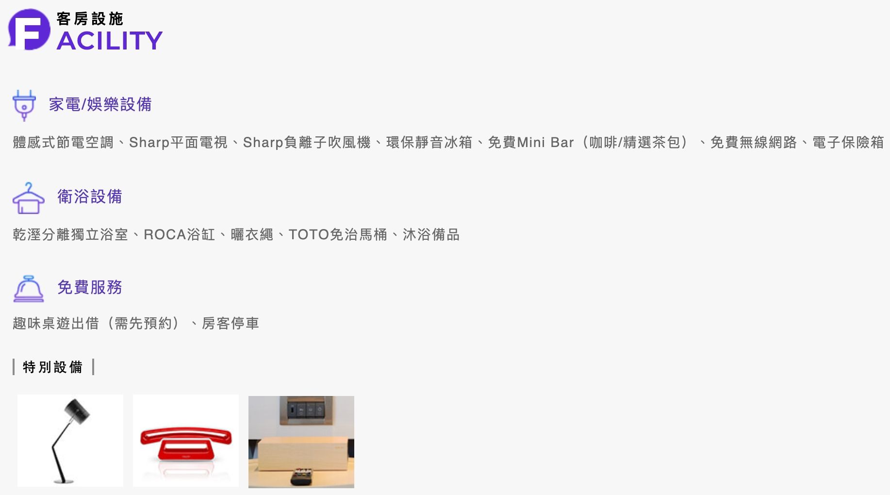 嬰幼兒設備:有,若有相關備品需求,請於填寫旅客資料時列入備註,我們將提出需求給飯店。