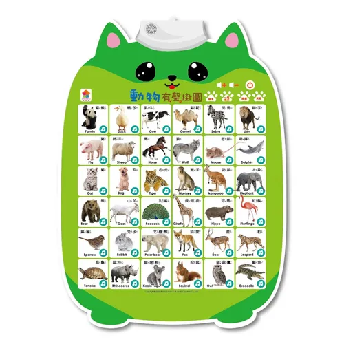 按一下就出聲,小朋友輕易就能上手喔!掛圖比書本好按,像是使用手指觸控書的時候,阿寶很喜歡不知不覺整個身體壓上去,然後就不知道他在按哪裡,但掛在牆壁上就沒這個問題了,操作起來很方便