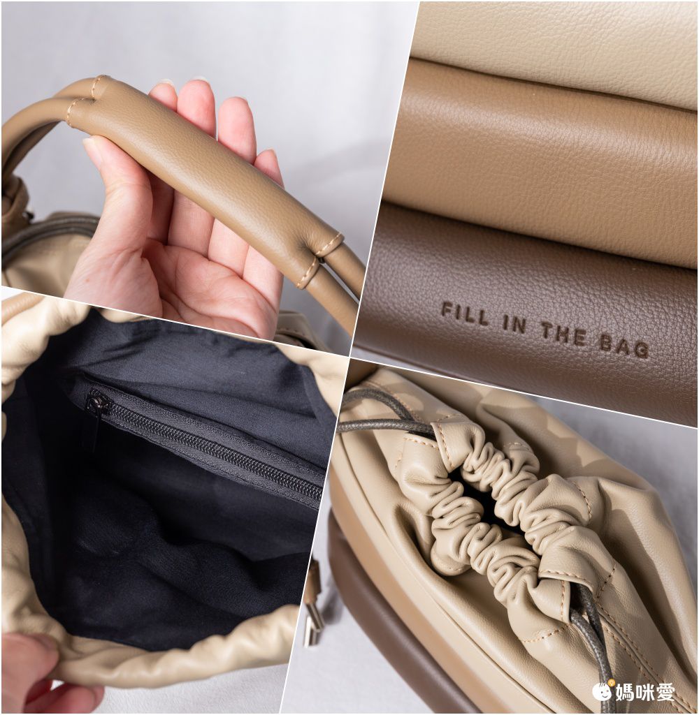 看著小小的,但其實可以帶的都能裝:口紅、短夾、手機等;裏面的束口內袋,不再擔心會被看到內容物而害羞啦~束帶一拉不怕掉出保有隱密感