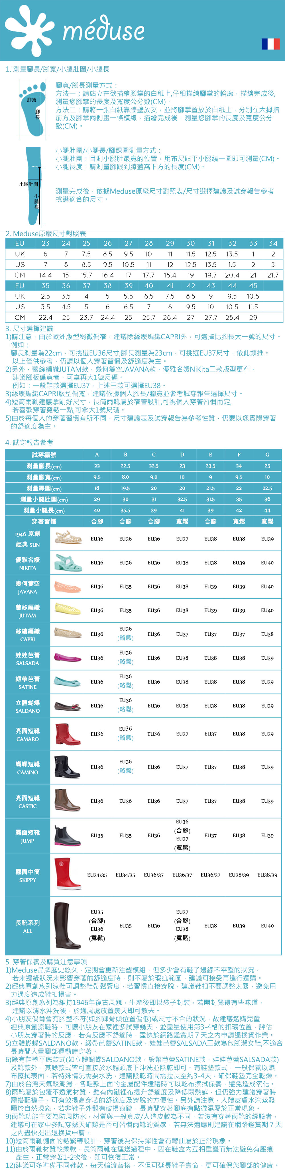 編媽這次要從法國帶來多款繽紛可愛的法國 Méduse 果凍鞋,他們家可是從 70 年前的第一雙果凍鞋開始,就堅持給把關好穿舒適的高品質,並不斷用創意撞擊出新色變化!利用新穎的工藝設計,讓我們不只得到輕便防水的好機能,在夏天雷陣雨午後輕盈漫步,還能穿出法國街頭的微甜浪漫♡ (購買前請參考下方「尺寸表」喔!)