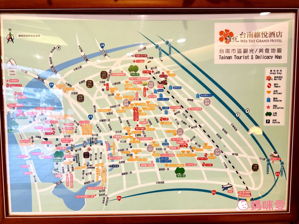 安平維悅酒店的交通位置非常棒!從飯店門口步行前往林默娘紀念公園、億載金城、安平老街都是不到15分鐘的時間即可抵達,想安排安平散策的行程可以在check in之後,便沿著運河畔散步走到這些地方,而且完全不用擔心停車問題,簡直完美!在大廳內也掛著一張酒店鄰近觀光與美食的地圖,可看到酒店附近無論步行、搭車都能到達許多重要觀光景點,地理位置非常方便。