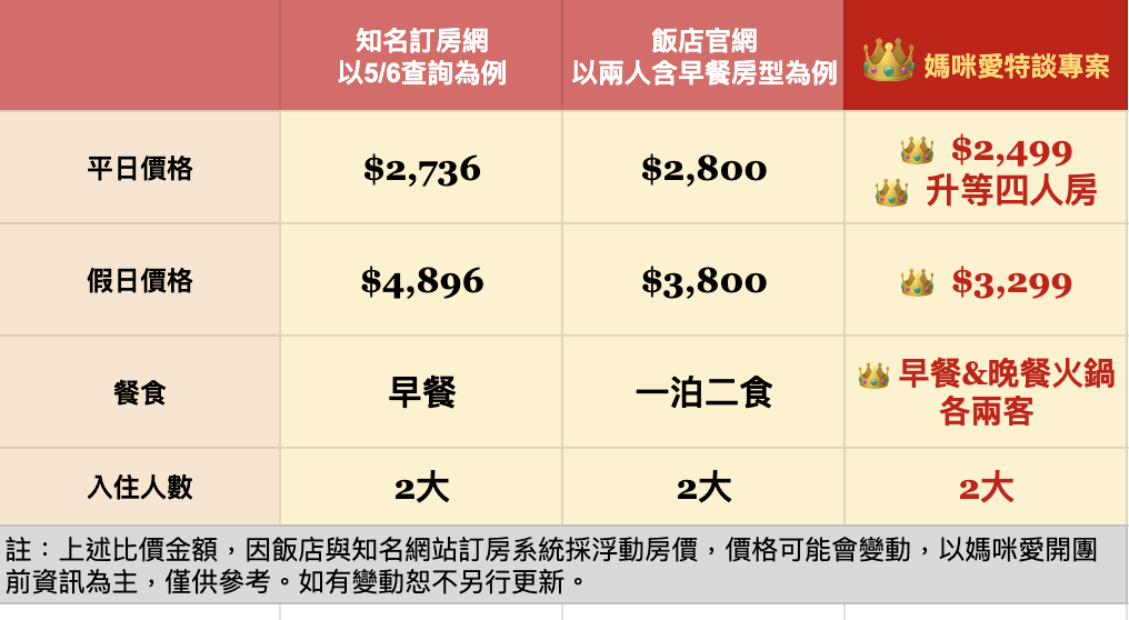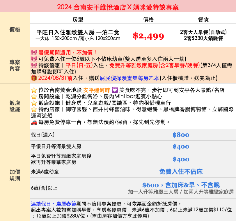 1. 加人加價|6歲(含)以上每人需加價$600,含早不含晚。加一位升等雅緻三人房、加兩位升等雅緻家庭房。