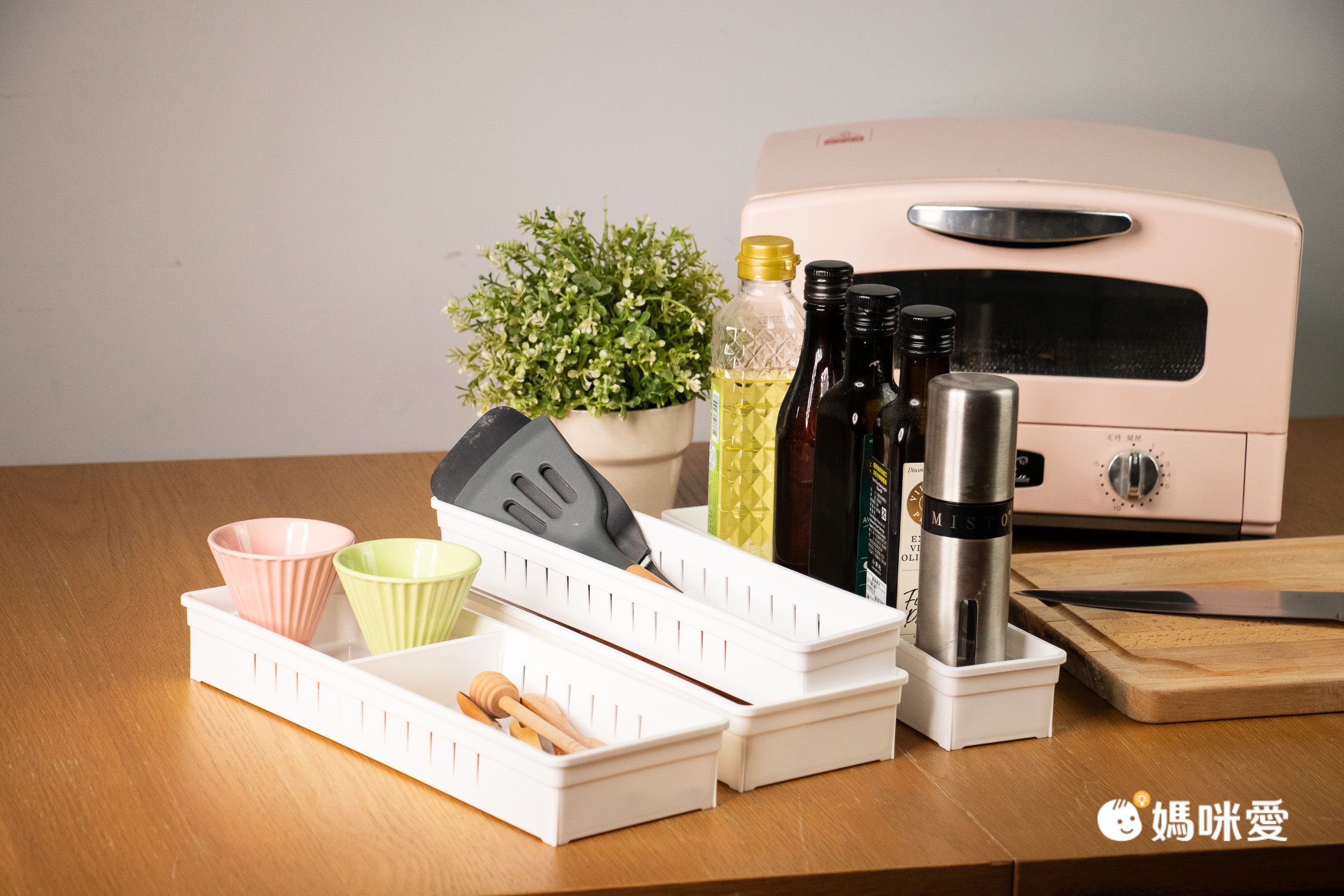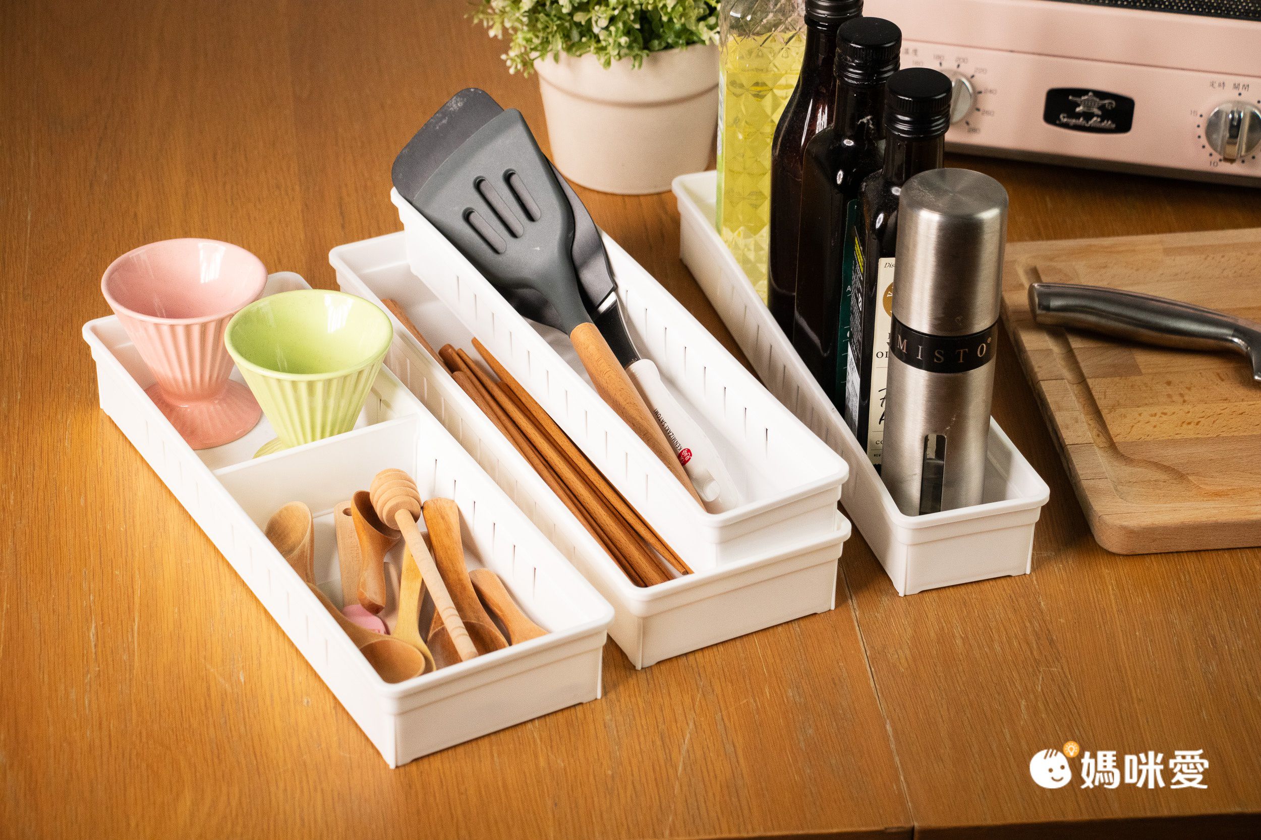從頭到尾、整個盒身都有卡楯,可以自由調整長度,對於餐具這類長短不一的工具們,可以隨情況不同隨時調整!