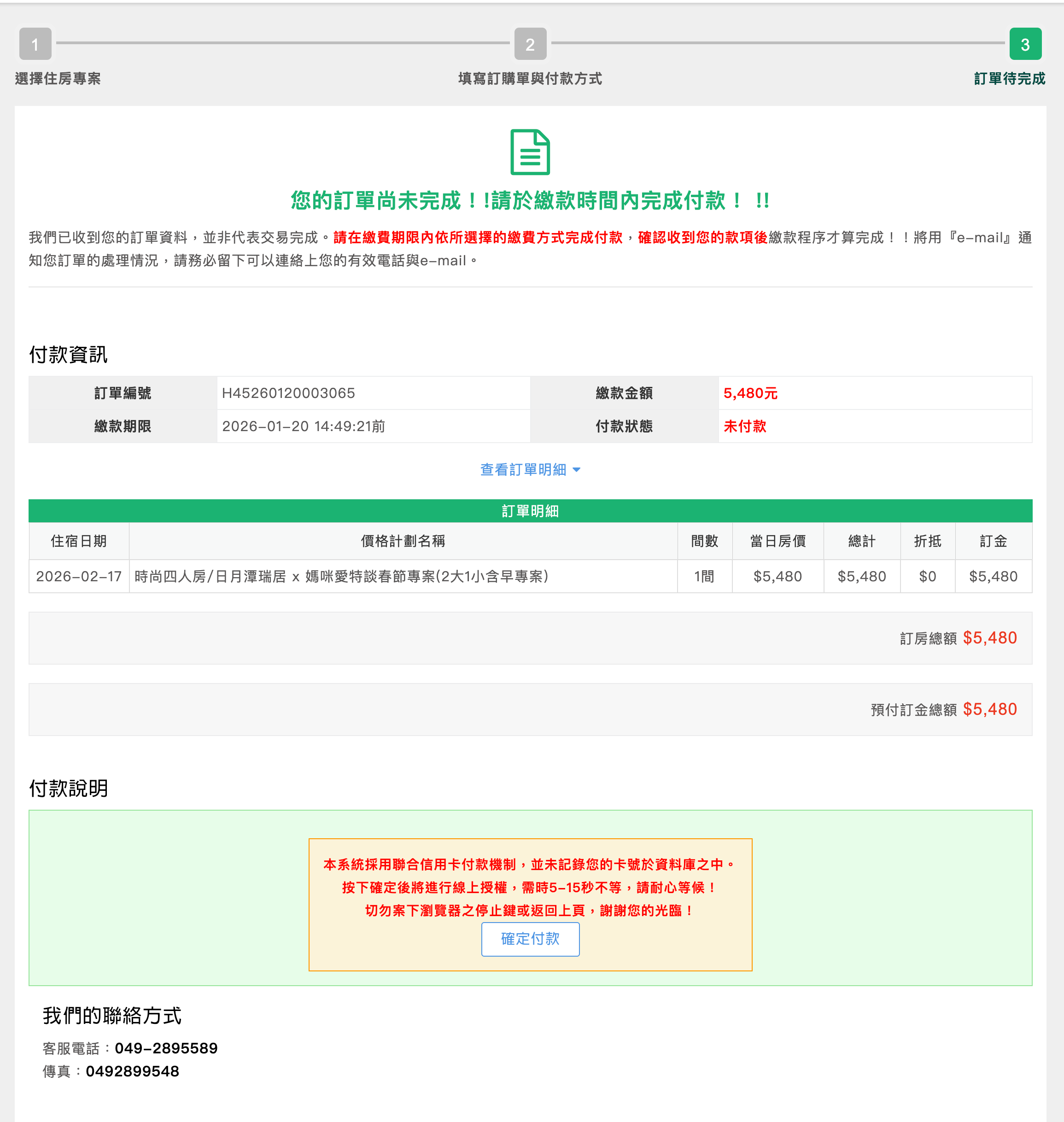 3. 詳閱訂單內容後,進行房費支付。(可國旅卡)