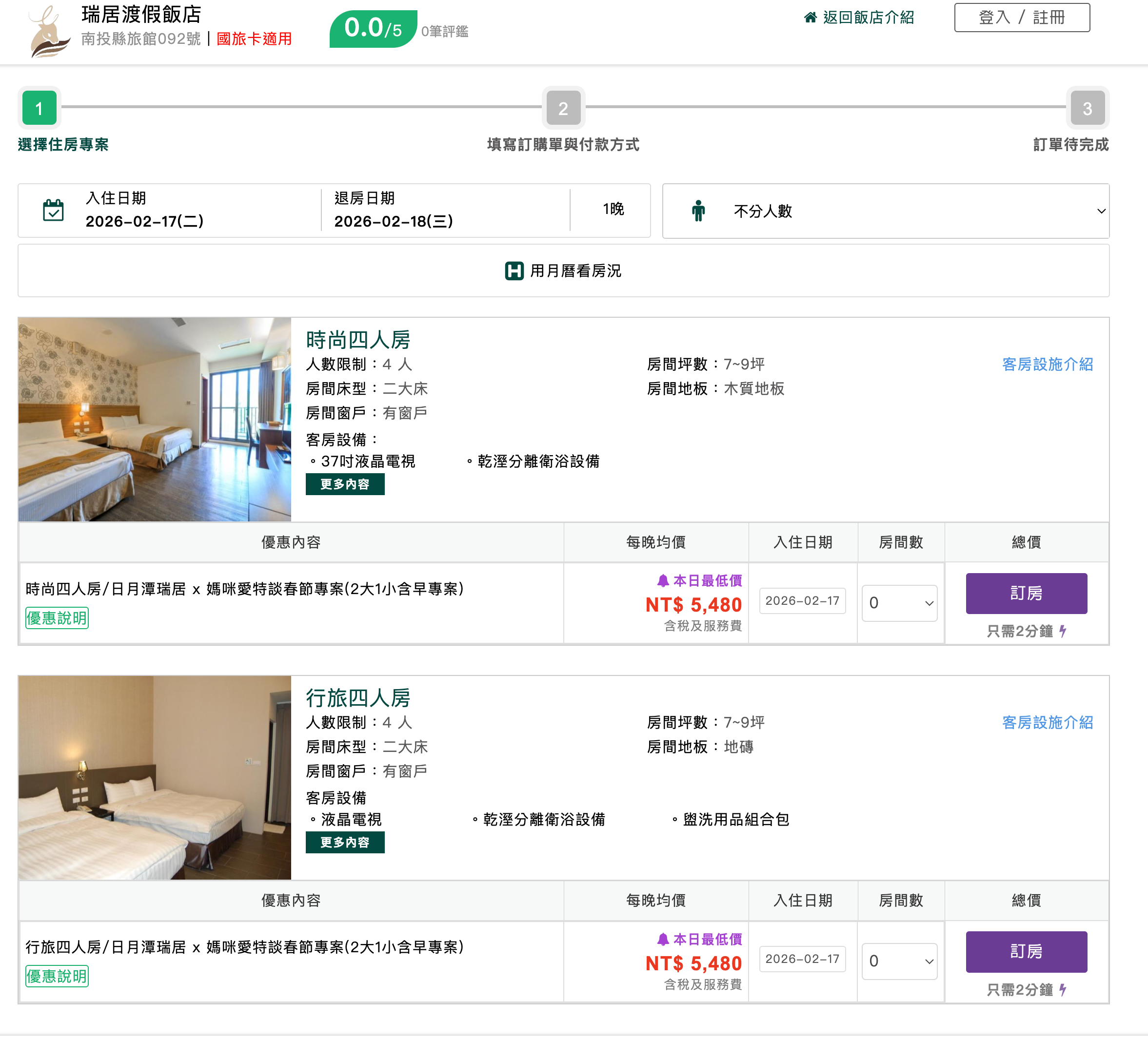 1. 點擊連至瑞居渡假飯店訂房專用網,選擇欲入住之日期(本專案限2026/2/17-20初一至初四入住)