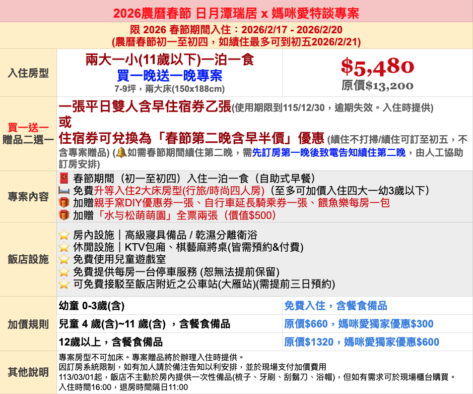 等於農曆春節兩大一小住兩晚只需要 8220!加送景點門票&日月潭周邊體驗券~