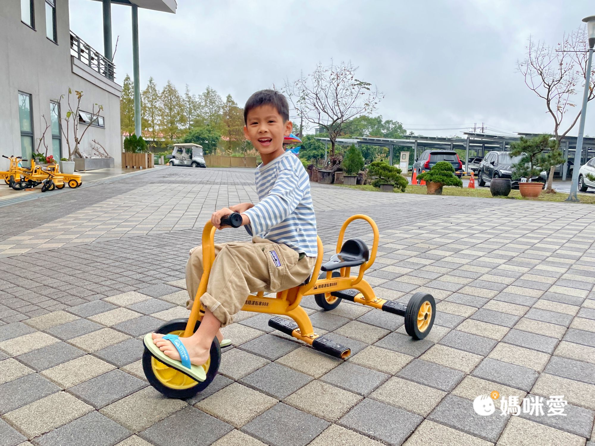我們這天大約2點抵達園區,光是在門口、湖邊走走拍照,就花了不少時間。我們入住的這天有提供迎賓下午茶(2pm-4pm),但孩子看到一堆車車就決定先去玩一波再回來吃了哈哈!營本部建築物旁邊還可以租借兒童電動車~