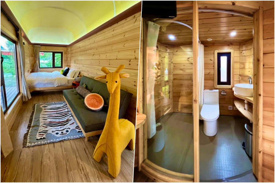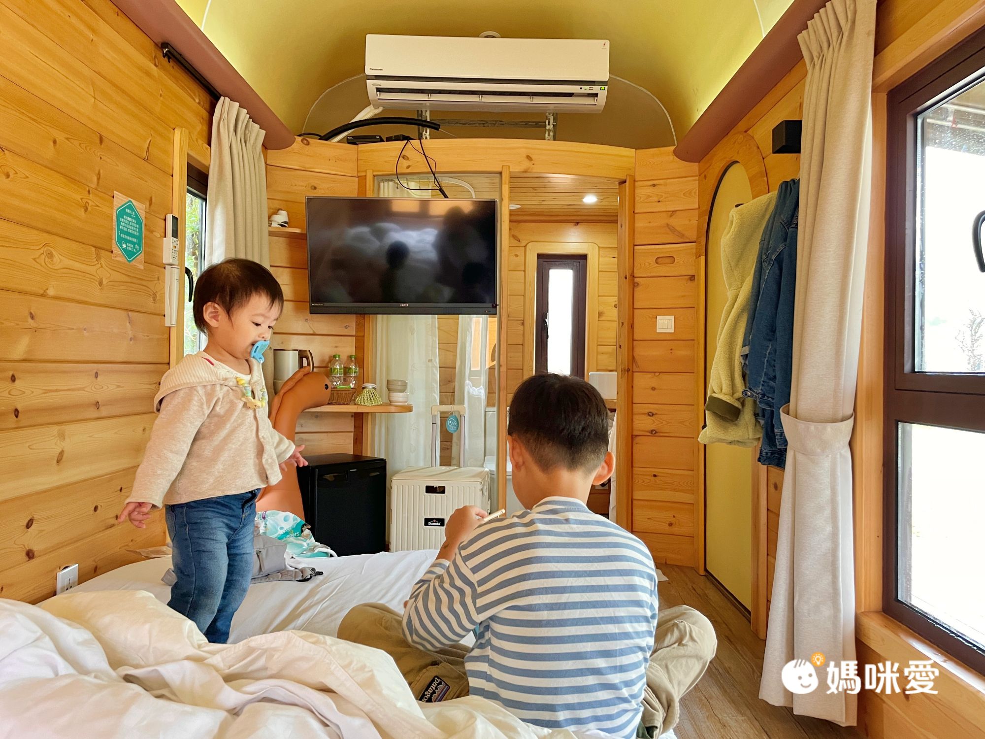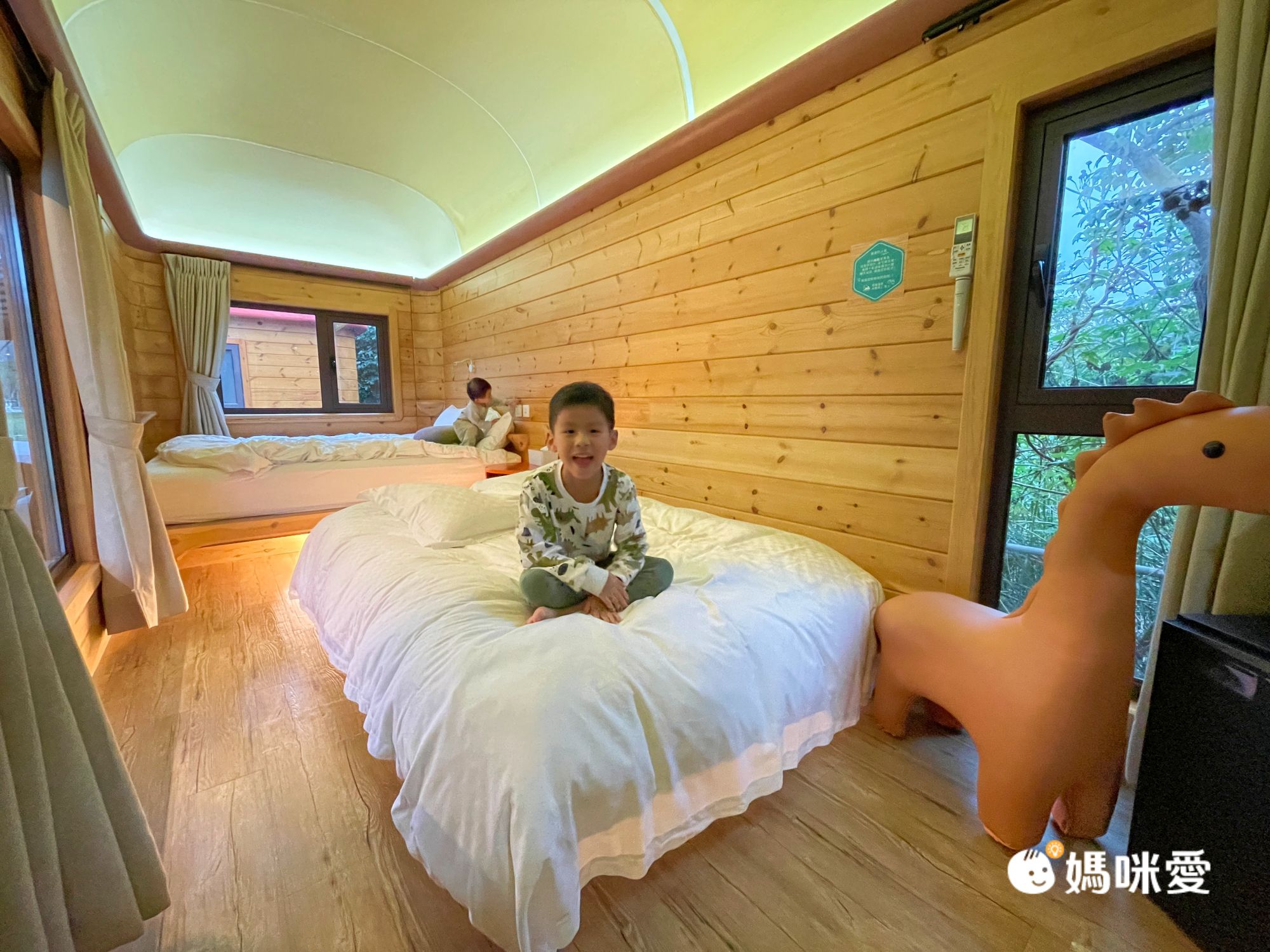 房內規劃有種坪效很高,又同時兼顧精巧舒適的感受。並且房內的冷暖氣超給力!我們晚上都穿短袖睡覺,室內溫度可以很暖不用擔心山區的寒冷會讓孩子著涼!這點真的非常重要,很多媽媽會選飯店而不選山區露營,就是因為不喜歡溫差大容易著涼的狀況。