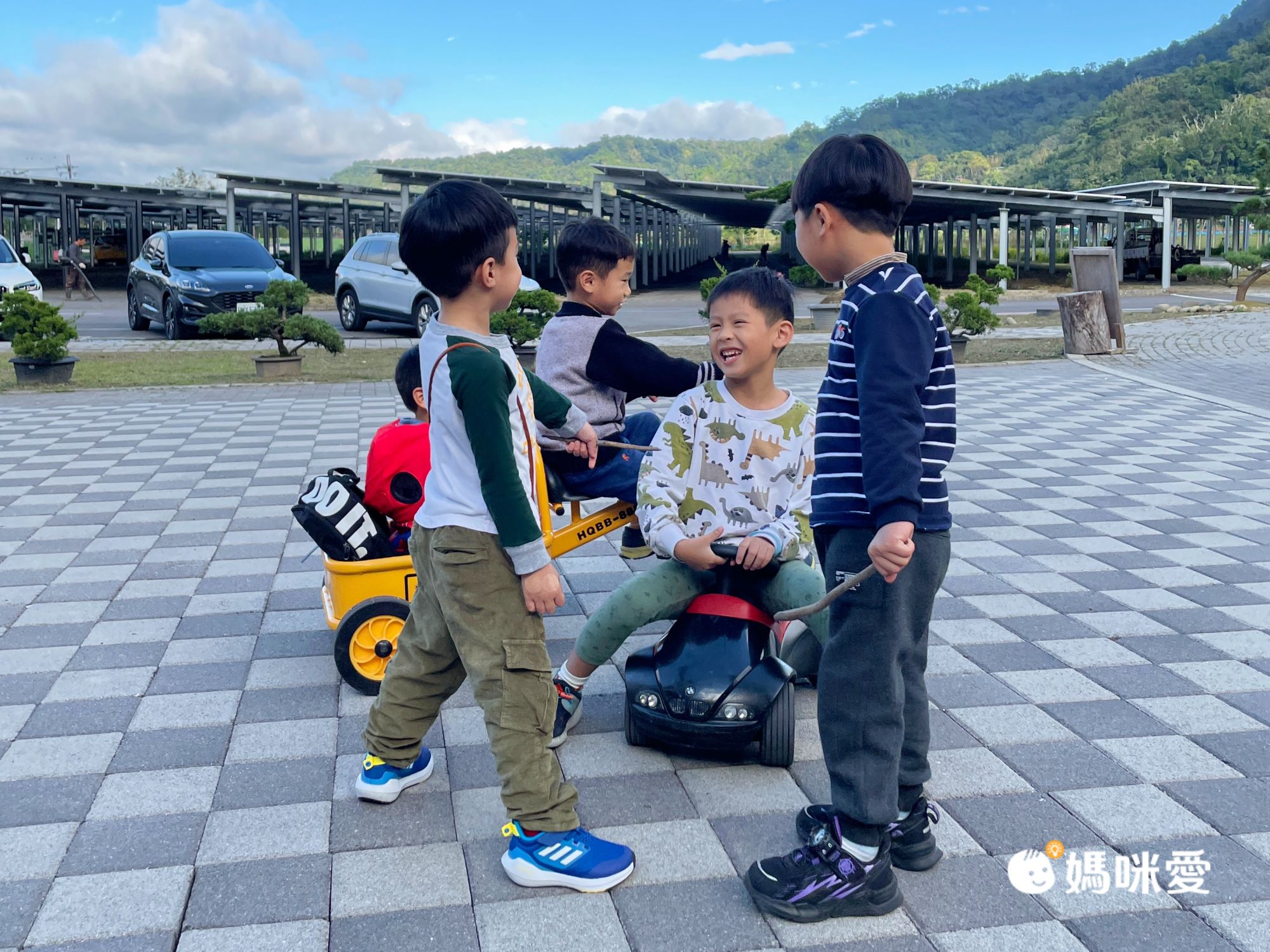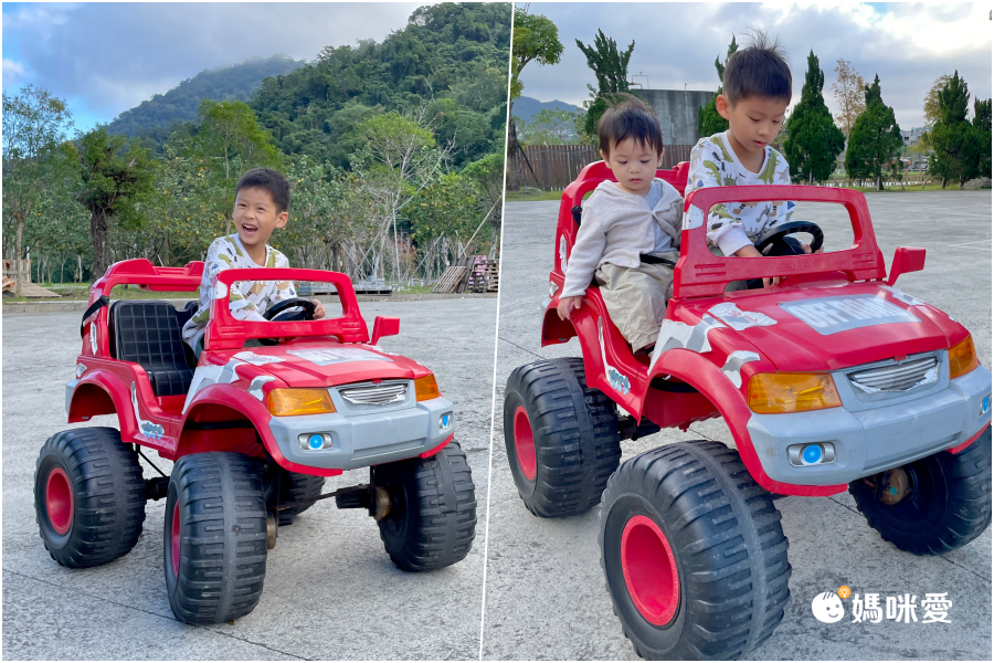 租借電動車旁空地是個斜坡,現場就三、四個孩子一起開著吉普車不斷來回玩衝下坡的遊戲,莫名就變成朋友了!後面P醬吃飯時還一直去找別桌的朋友們聊天,果然這就是親子露營區的魅力吧~