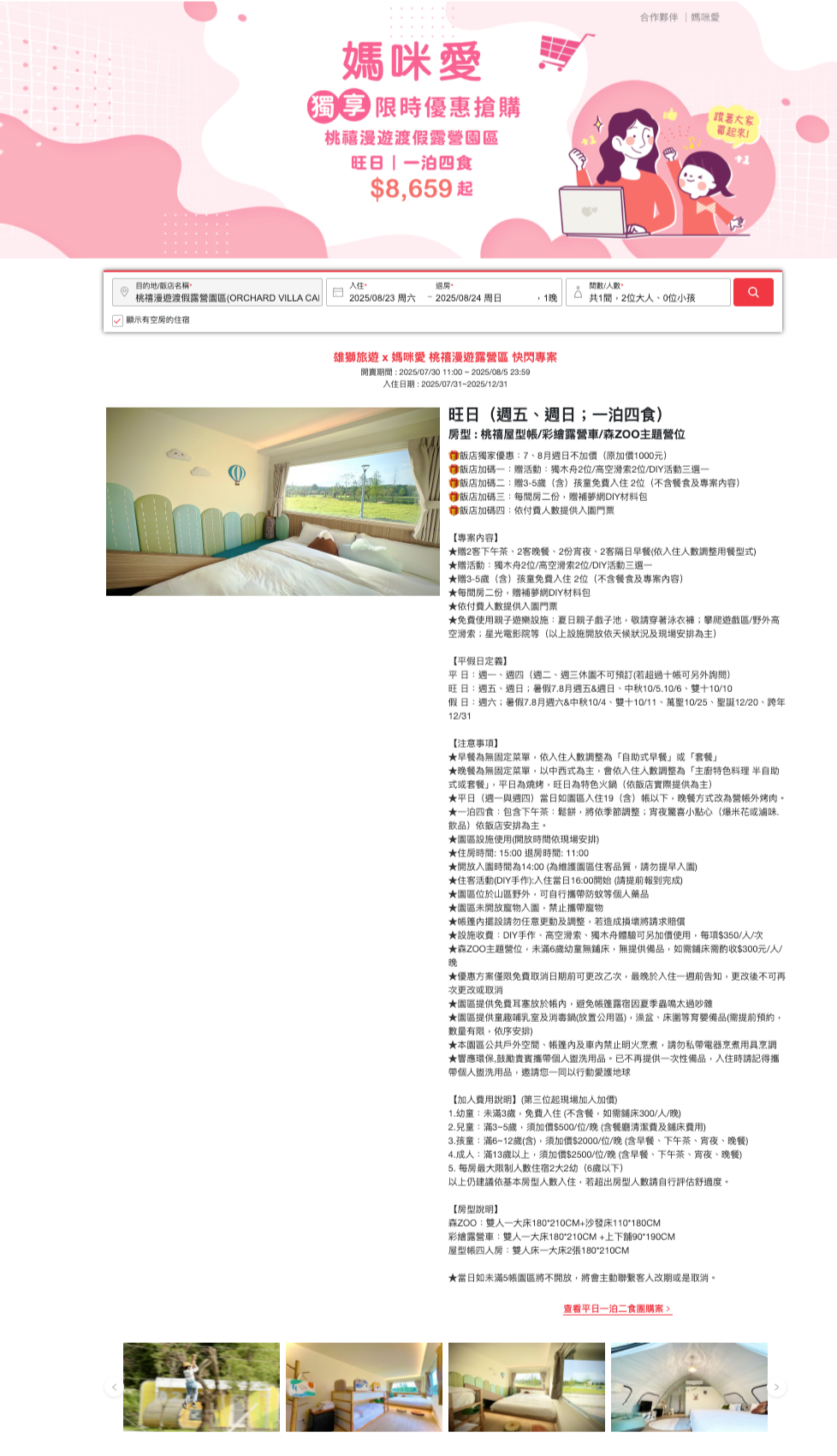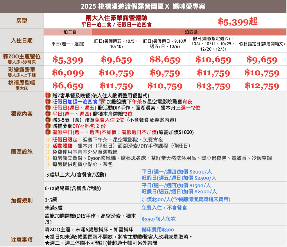 註:「彩繪露營車」與「桃禧屋型帳」至多入住四大或兩大兩小。