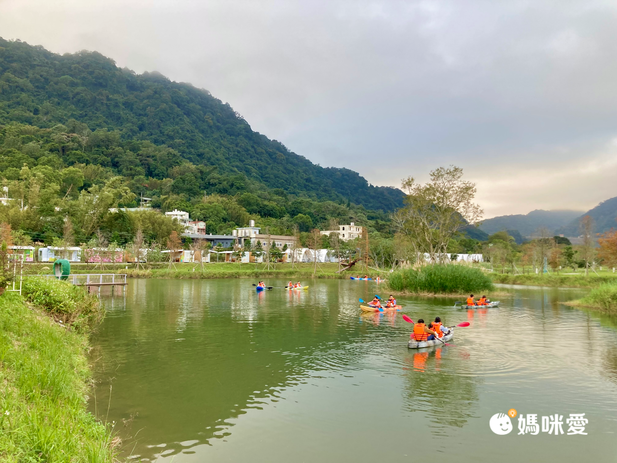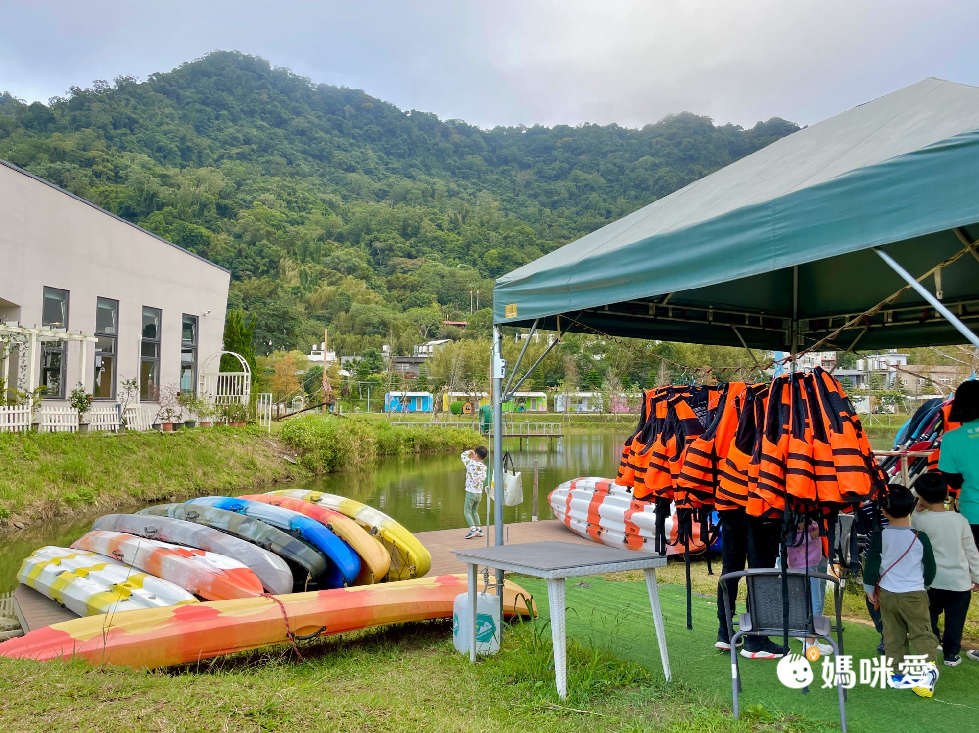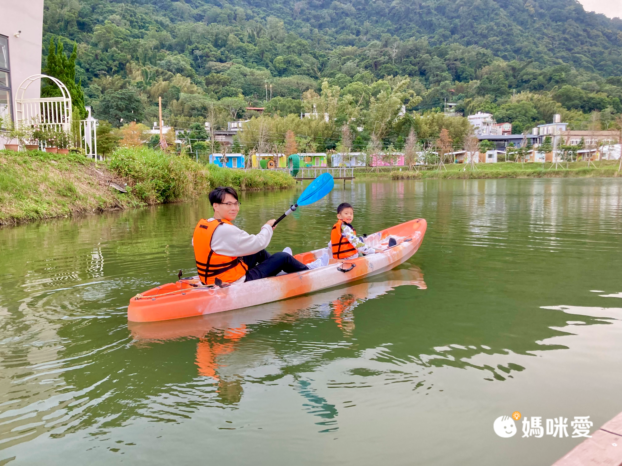 我們入住當天16:00-16:40可以體驗划獨木舟,最多可2大2小,不過必須要能穿救生衣的年齡才可上船,所以這次只有爸爸可以陪P醬去玩,我就在岸邊顧沐沐,然後幫忙拍照、錄影。