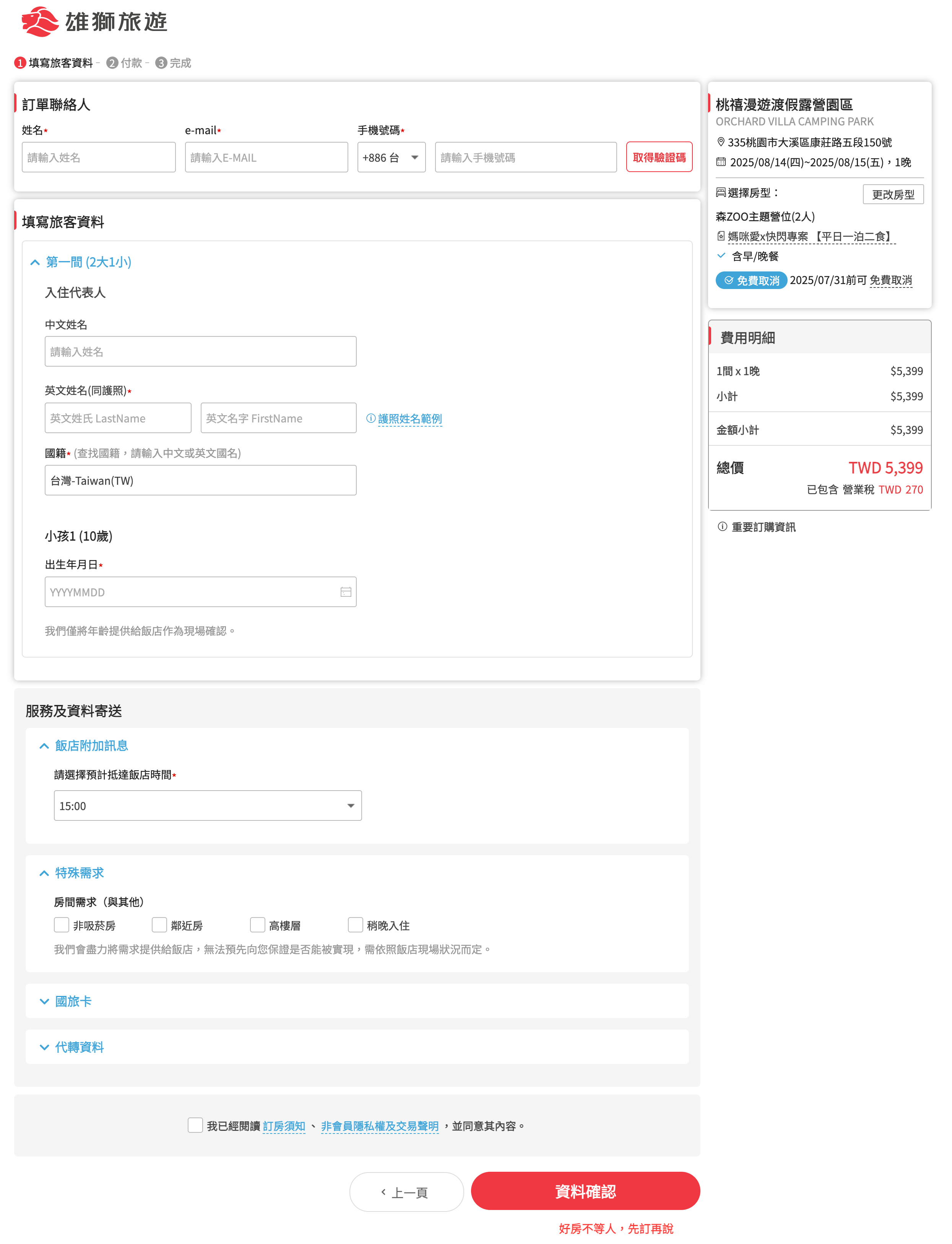 3. 填寫旅客資料、小孩出生日期(現場飯店可能會須核對健保卡資料)與相關特殊需求、是否使用國旅卡後,即可進行付款~(★此為2人入住價格,第3位起須現場付加人加價費用★)