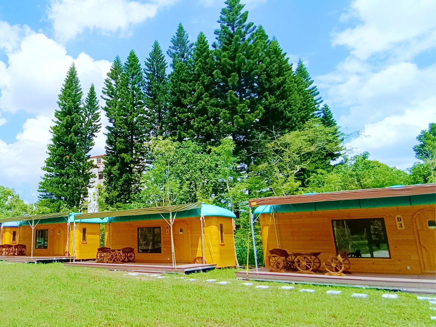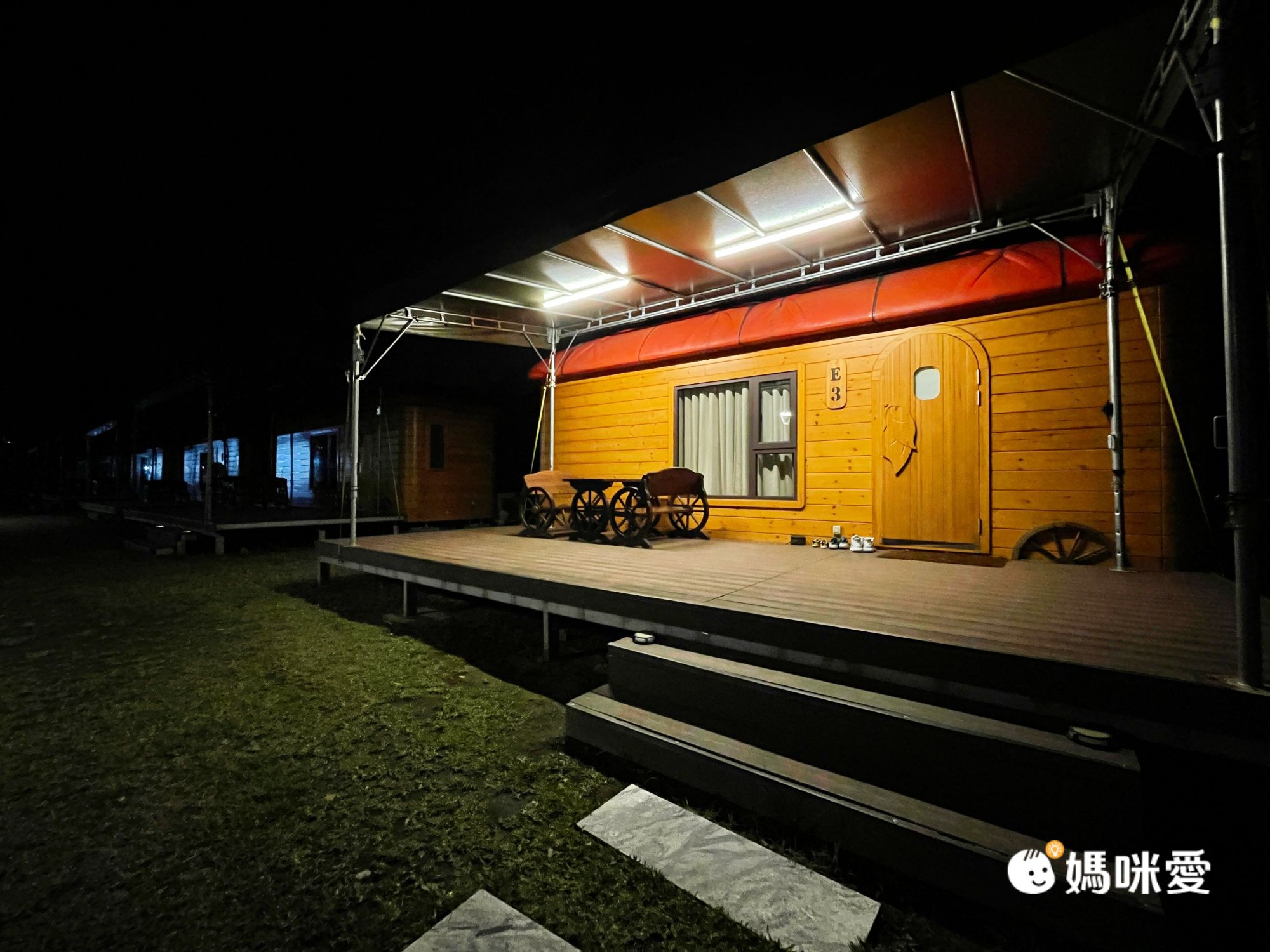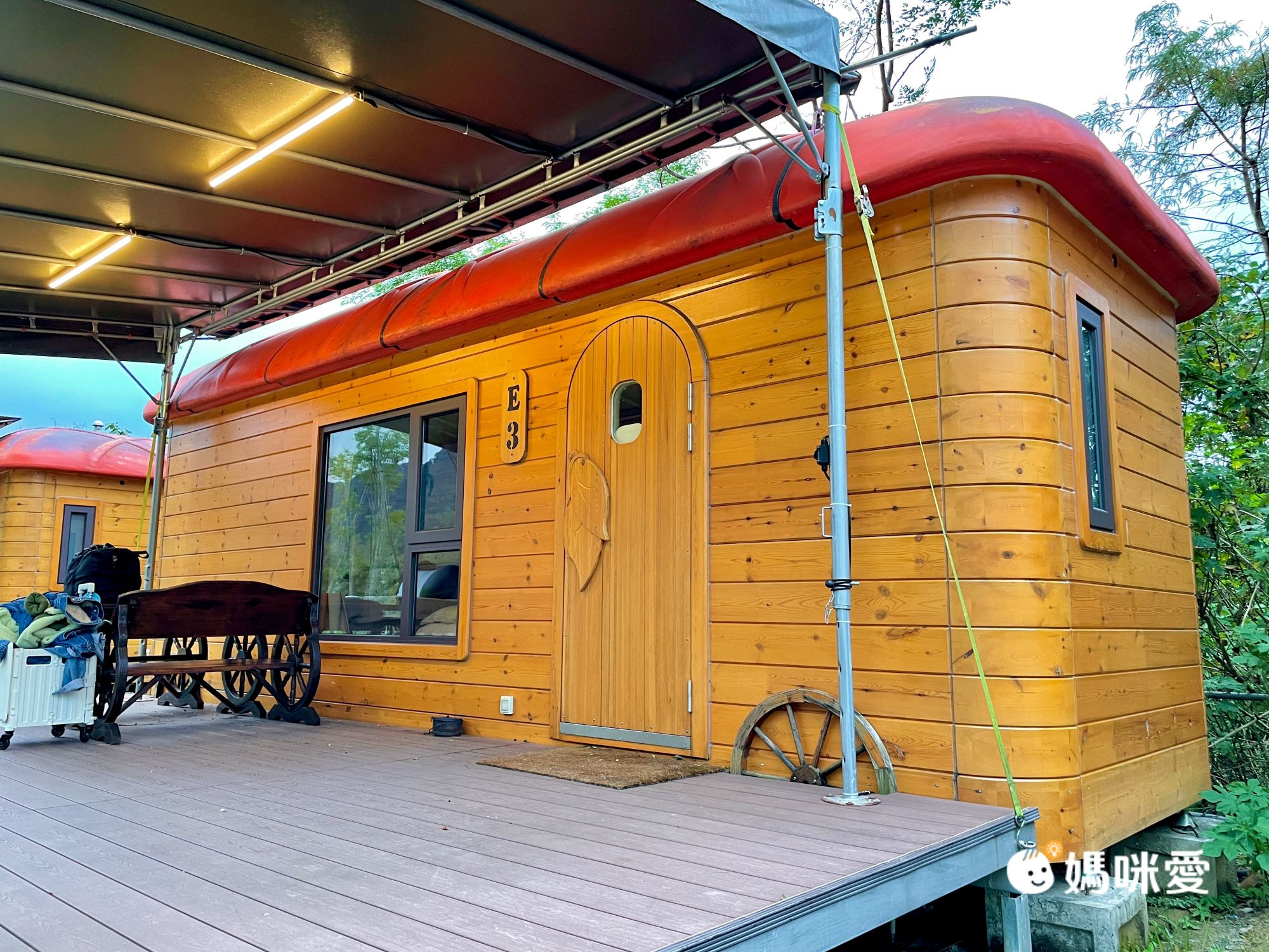 這是我們這次體驗住宿的小木屋~!超期待的!屋前有遮雨棚跟私人平台、可以坐在這看山景發呆聊聊天~