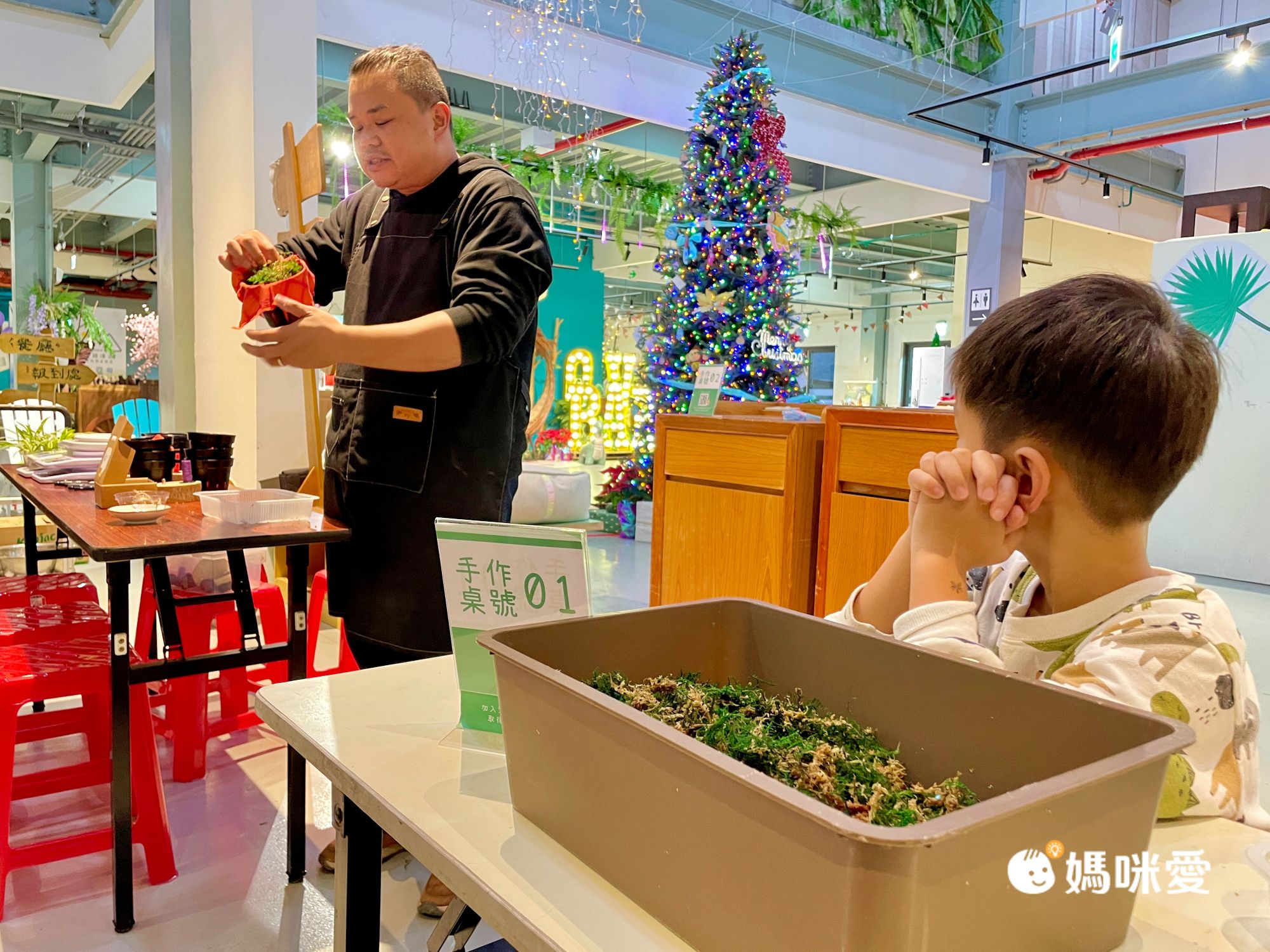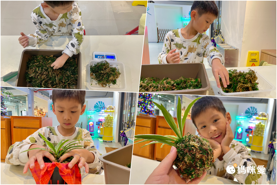 五點還有植栽手作可體驗,因為只有一場且有名額限制,需要提前先在櫃台報名。我帶著P醬一起去玩,其中只有在綑綁時,會需要大人在旁協助孩子,老師選擇的植物是日常中,非常簡單好照料的植物,不用擔心回家後該怎麼養。