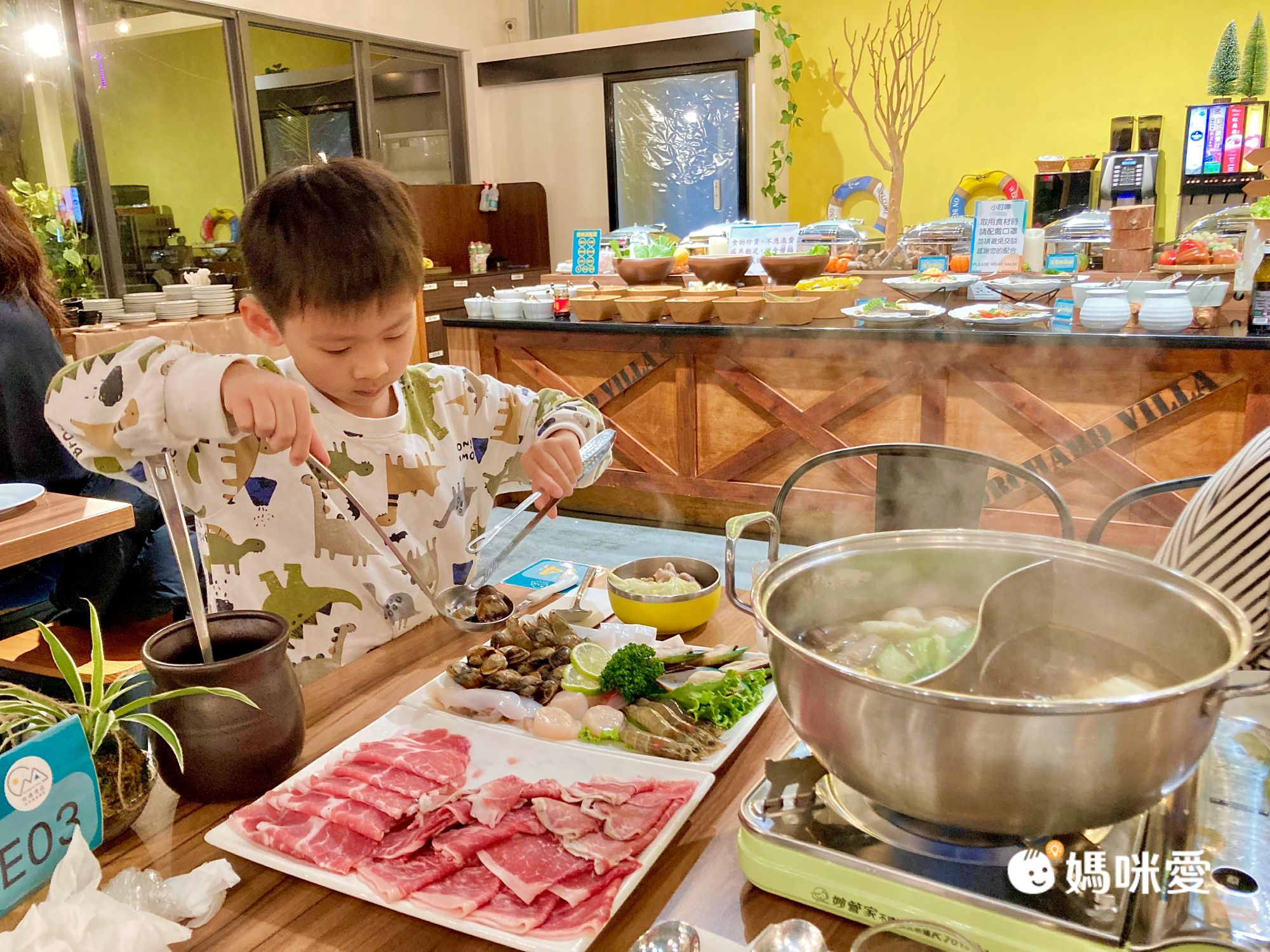 馬上6點就到了晚餐時間,湯頭很清爽的鴛鴦鍋,配上滿滿滿肉盤、海鮮盤,及豐盛的自助吧,對我們一家來說真的有點太多....我們只能先把桌上的肉盤、海鮮盤吃完。