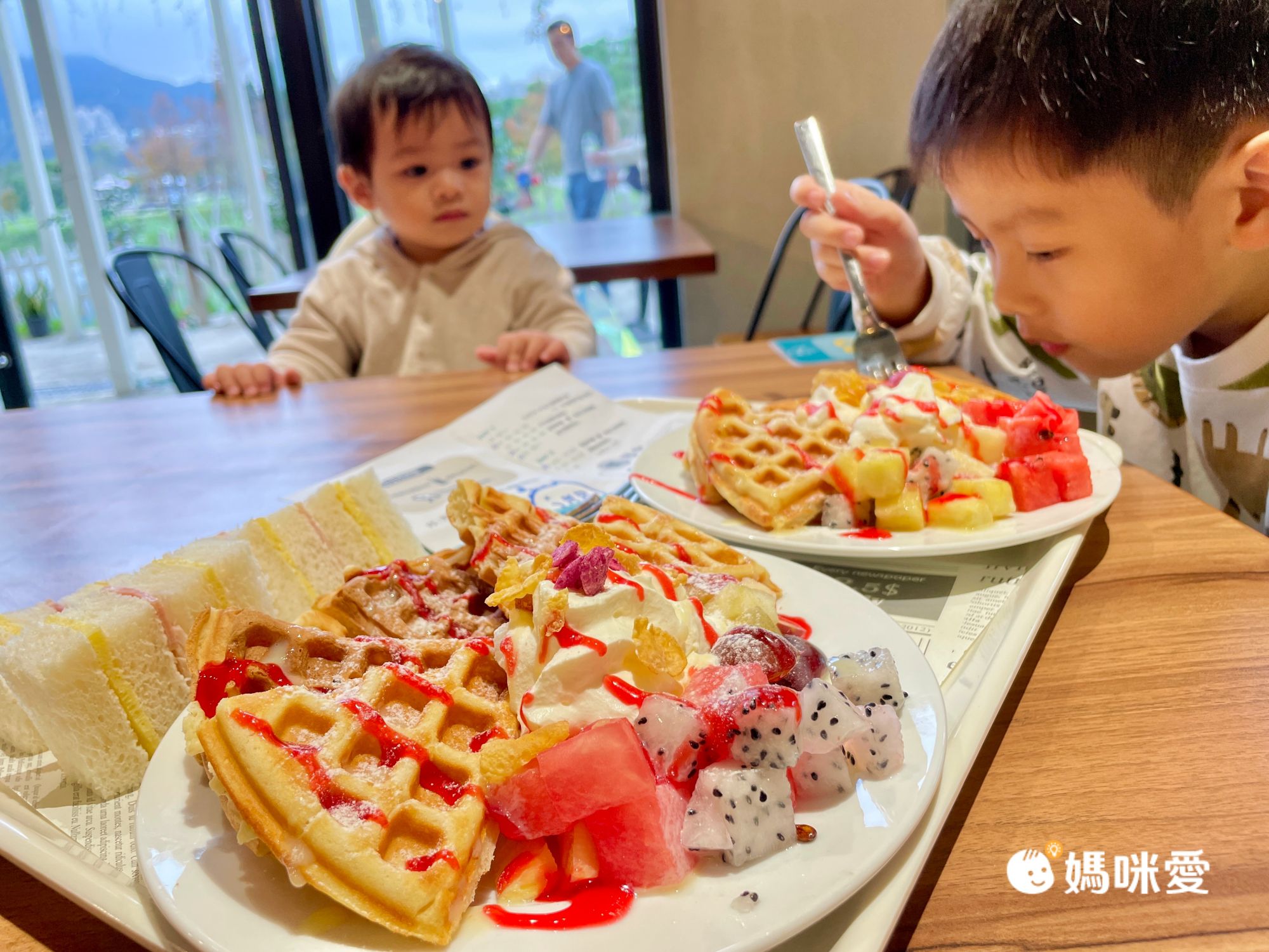 我們趕在下午茶4點結束前去用餐,餐點是一份水果鬆餅及小三明治,園方會按照人數提供份量,非常大氣地給了我們一家四口滿滿2盤!孩子們吃得很滿足,不用吃到太飽,因為稍後很快又要享用美味的晚餐了。