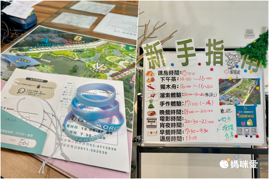 完成入住手續之後,會按照入住人數提供【桃禧漫遊度假露營園區】專屬的漸層手環(供兌換體驗活動用)、行李吊牌呦!大廳也會公告每一項活動、餐食的時間喔!(請依現場公告為主)