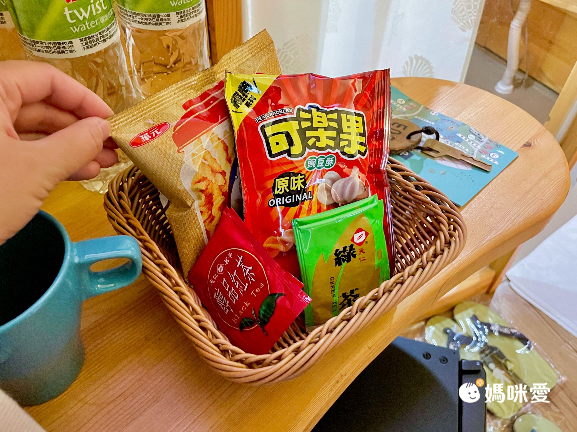 房內備品很完善,每人附一雙拖鞋,大人孩子都有,還有一個紮實好用的提袋,通通可以帶走!基本的點心、飲水、快煮壺、吹風機很齊全,不用擔心有缺。