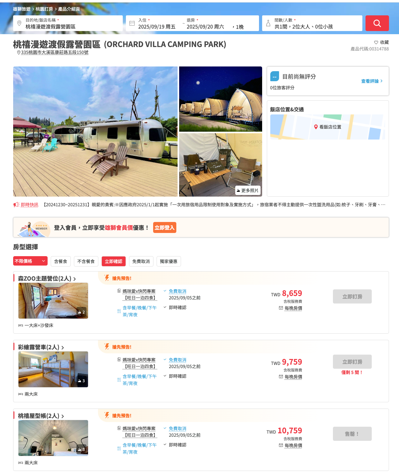 2. 選擇入住日期、人數後,點選查詢,如果下方沒有出現「立即訂房」則表示該日已無房間,請媽咪再試試其它日期即可喔!