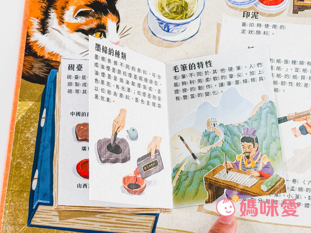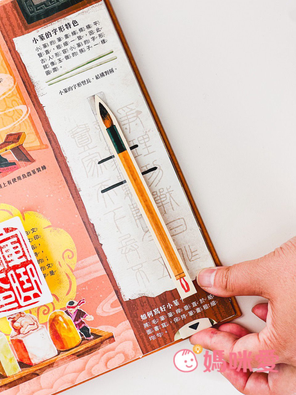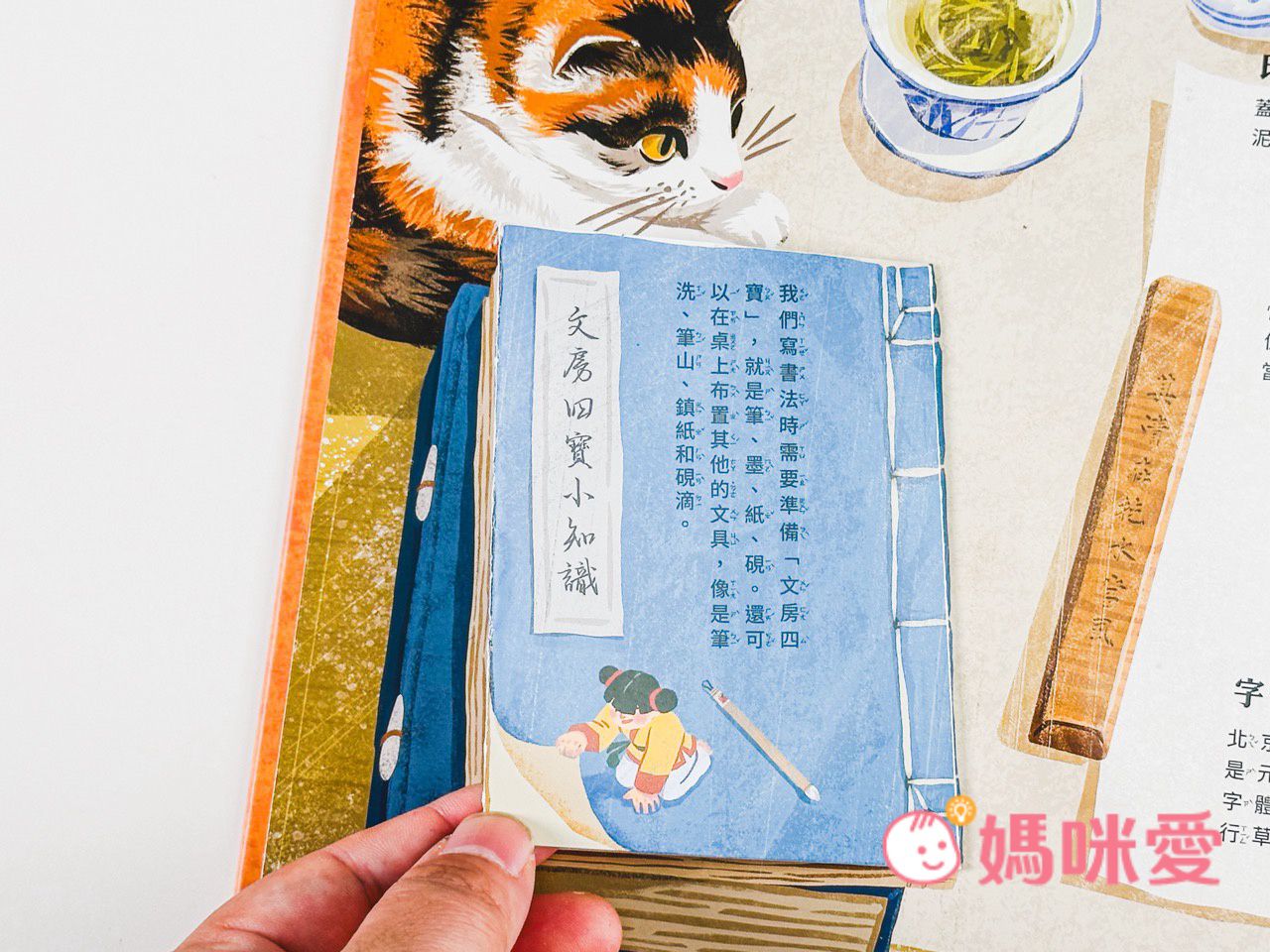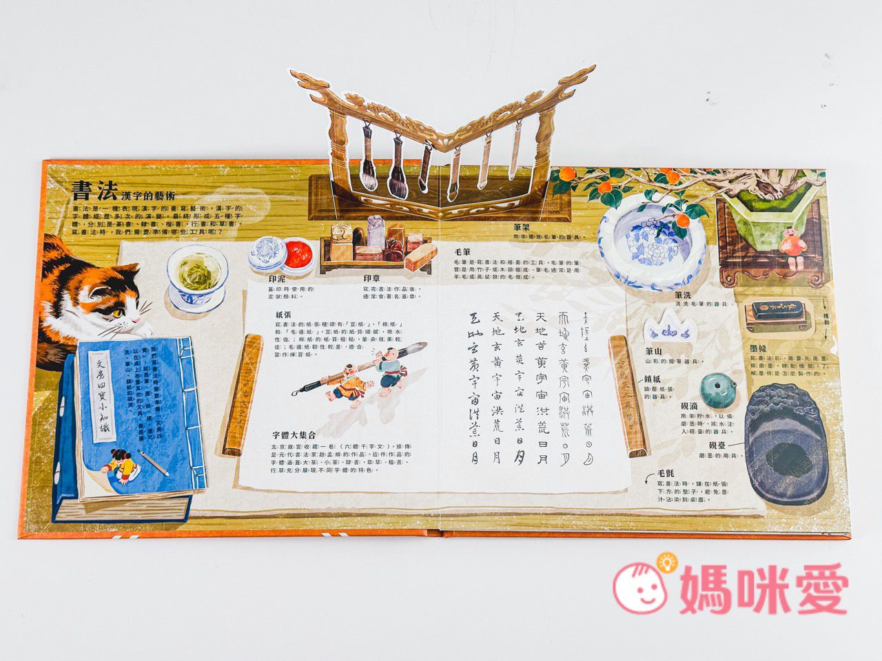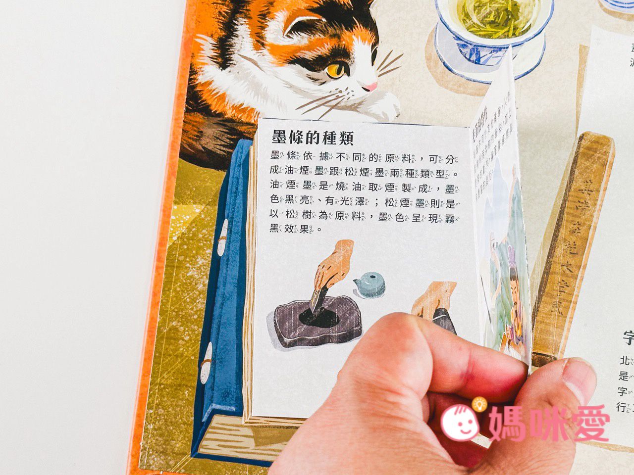 書中左下角還有一本小小的《文房四寶小知識》讓孩子能知道像是:毛筆的特性、墨條種類、硯臺、宣紙的製作過程等知識