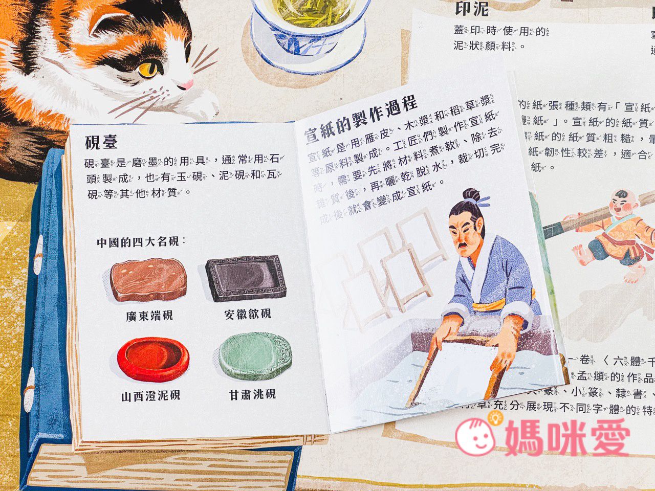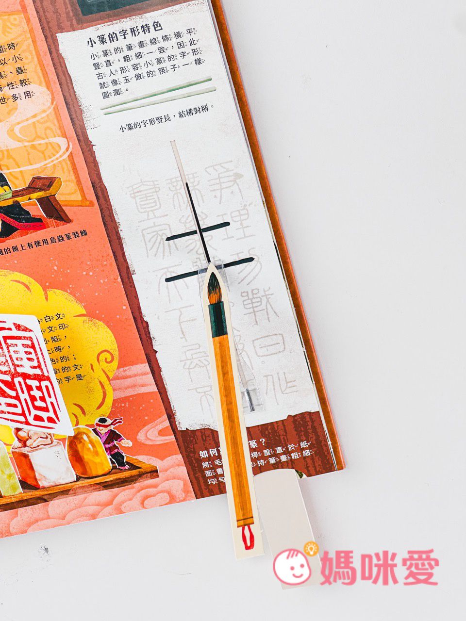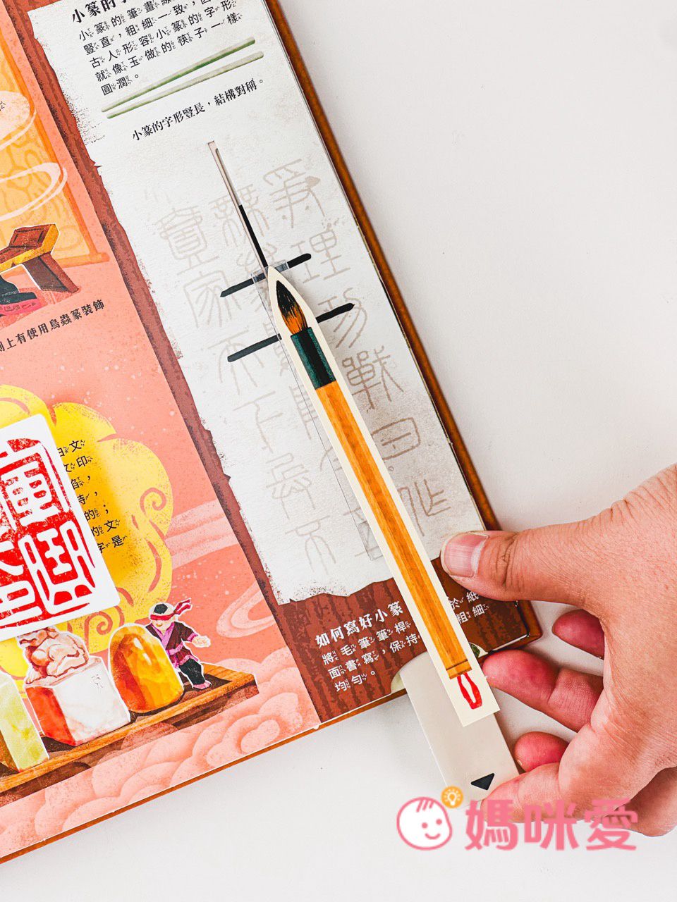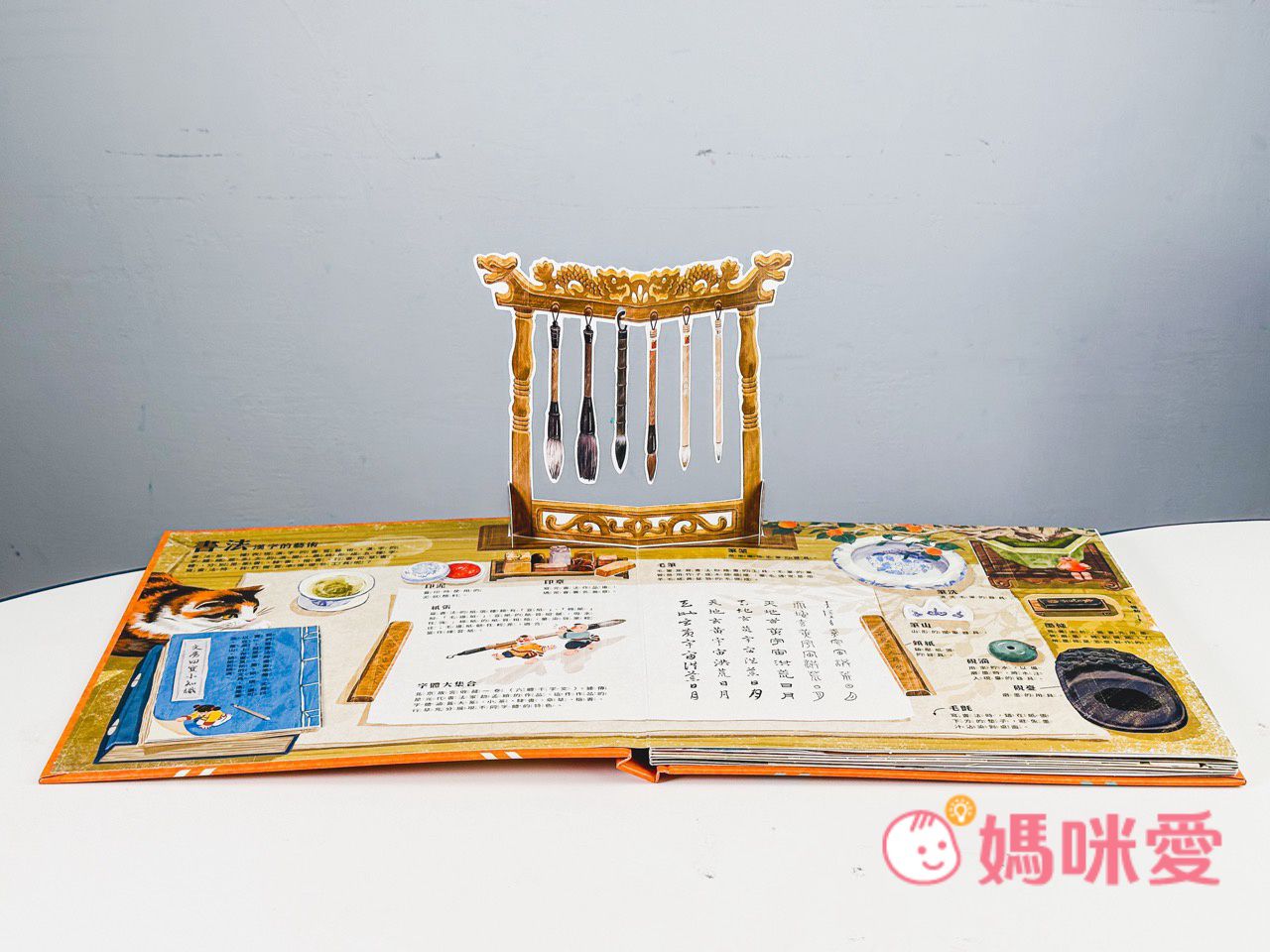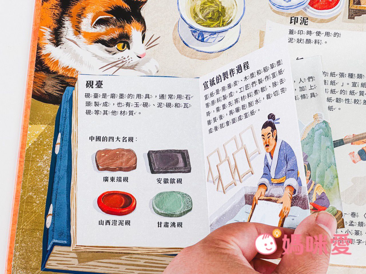書中左下角還有一本小小的《文房四寶小知識》讓孩子能知道像是:毛筆的特性、墨條種類、硯臺、宣紙的製作過程等知識