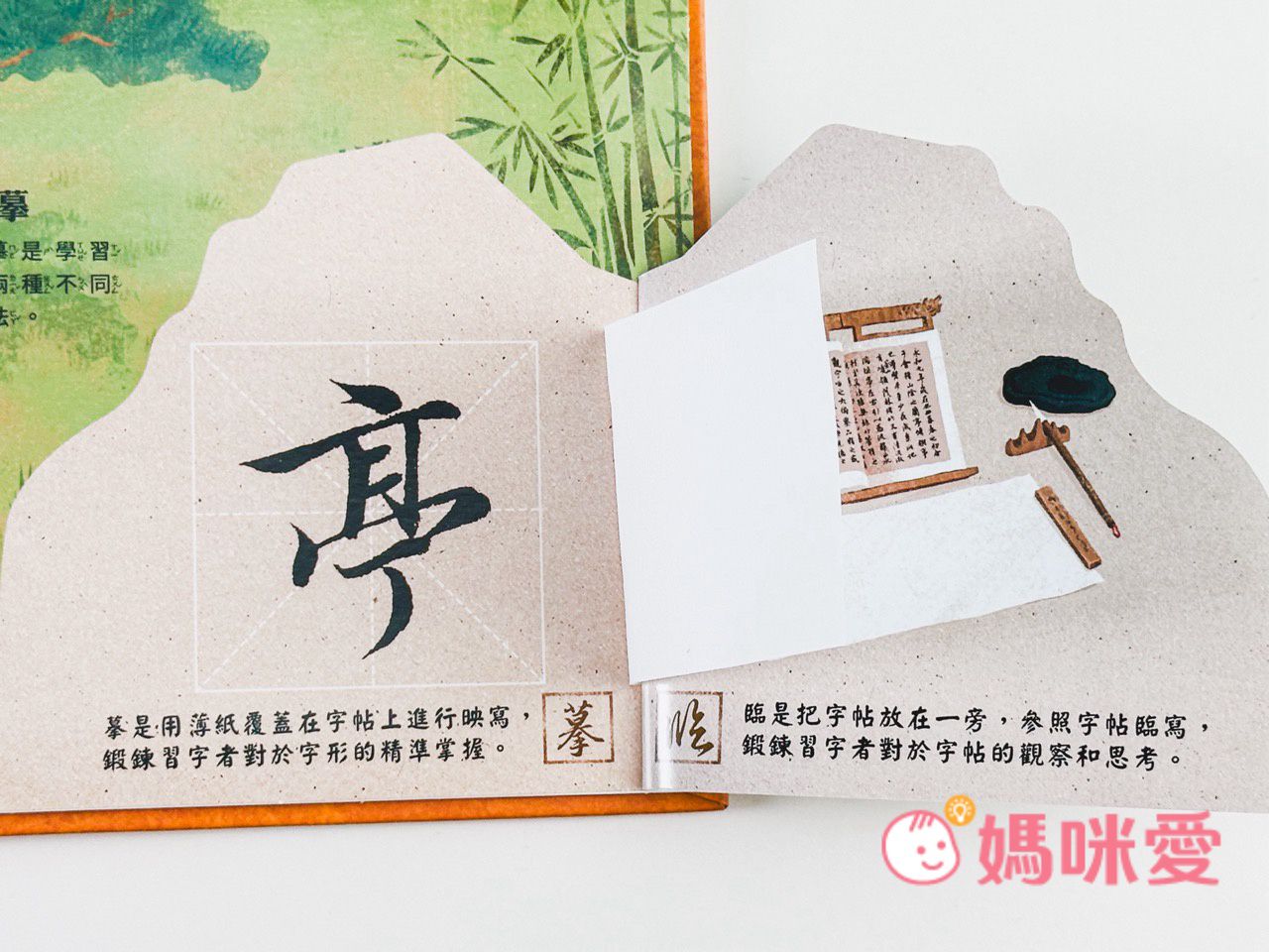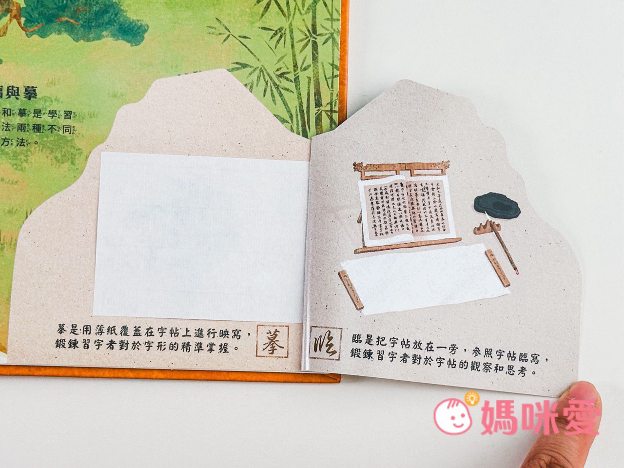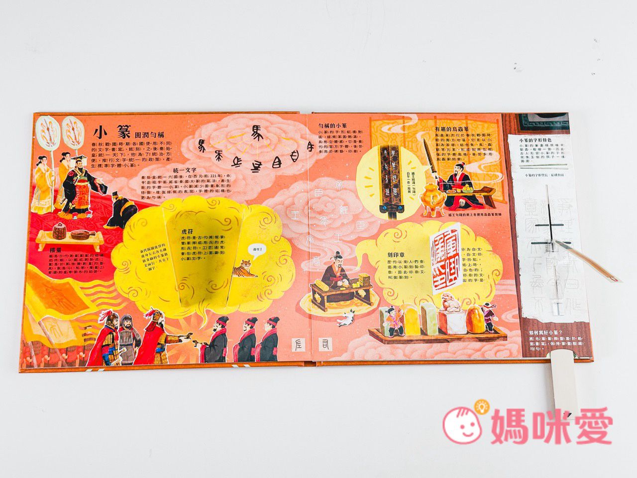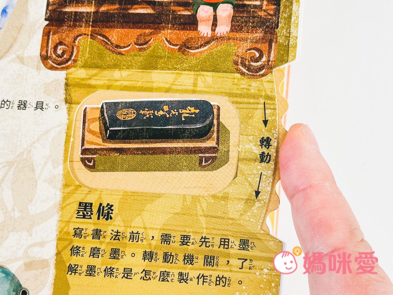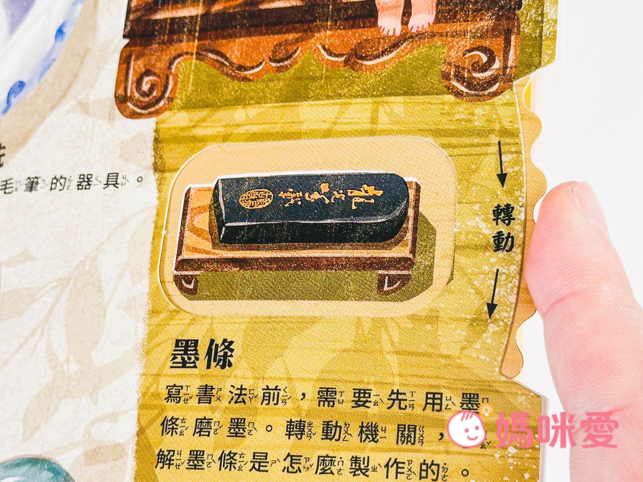 書中左下角還有一本小小的《文房四寶小知識》讓孩子能知道像是:毛筆的特性、墨條種類、硯臺、宣紙的製作過程等知識