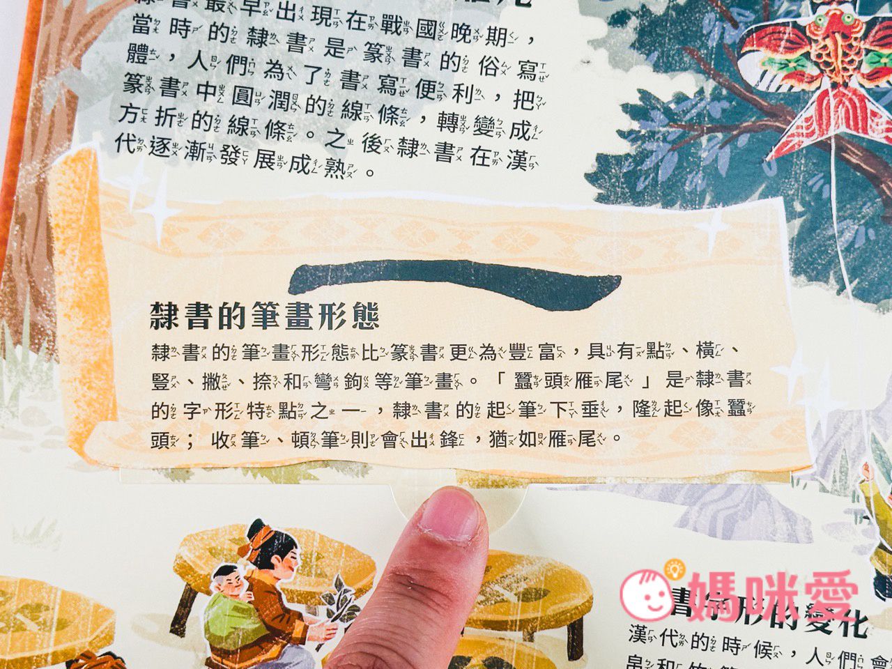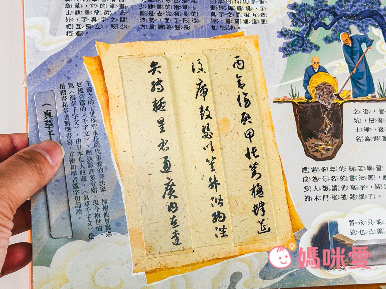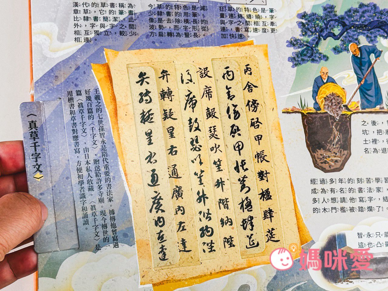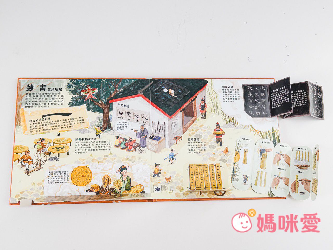 書中左下角還有一本小小的《文房四寶小知識》讓孩子能知道像是:毛筆的特性、墨條種類、硯臺、宣紙的製作過程等知識