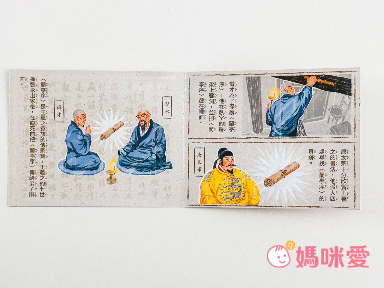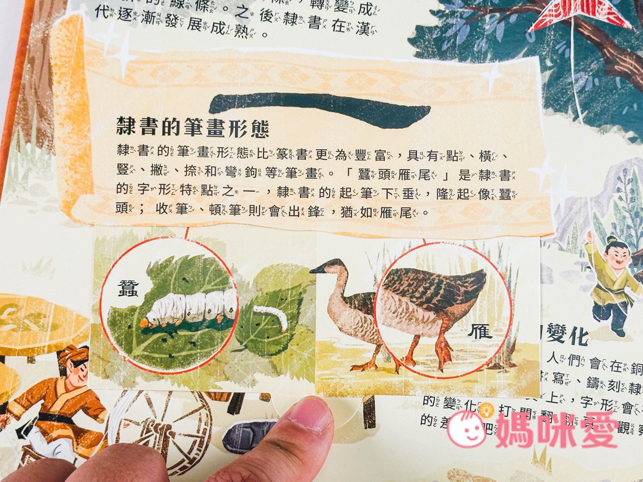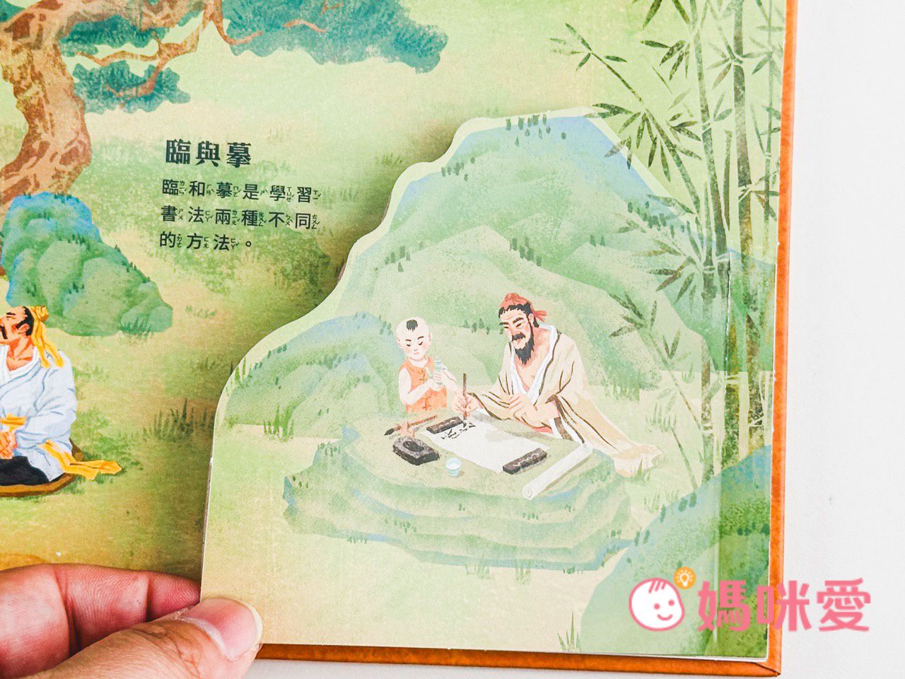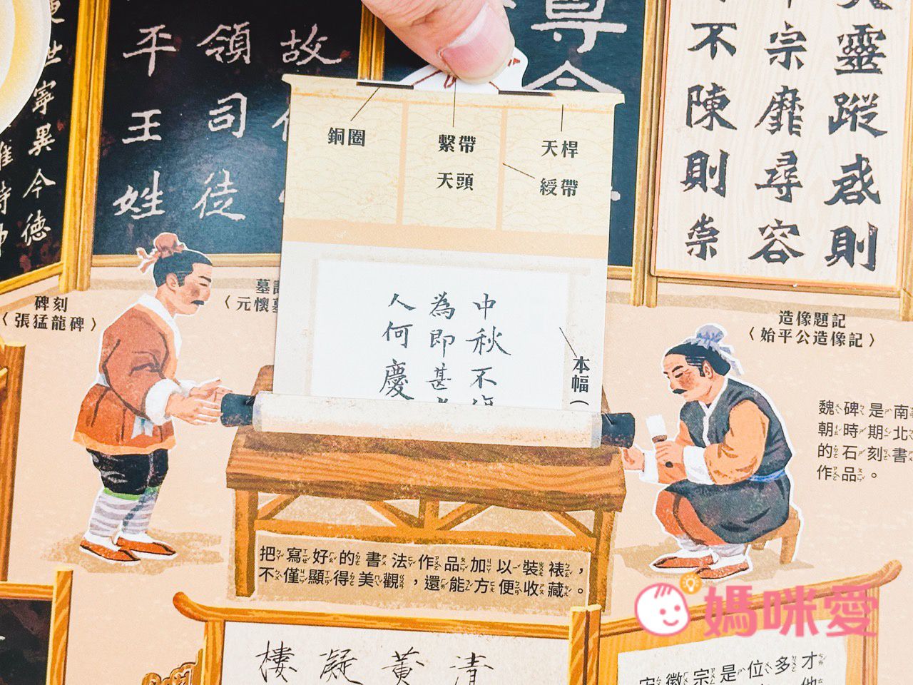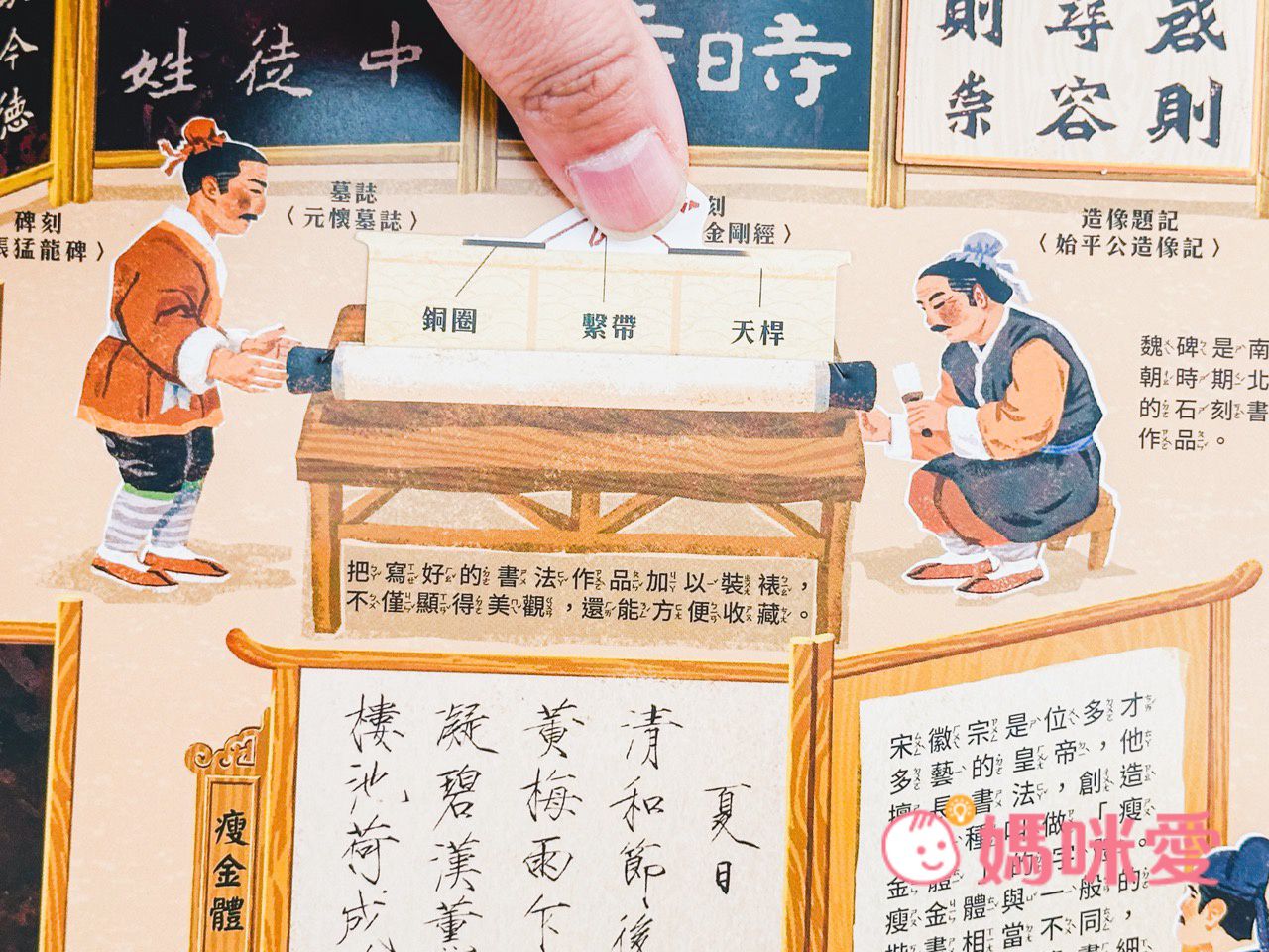 書中左下角還有一本小小的《文房四寶小知識》讓孩子能知道像是:毛筆的特性、墨條種類、硯臺、宣紙的製作過程等知識