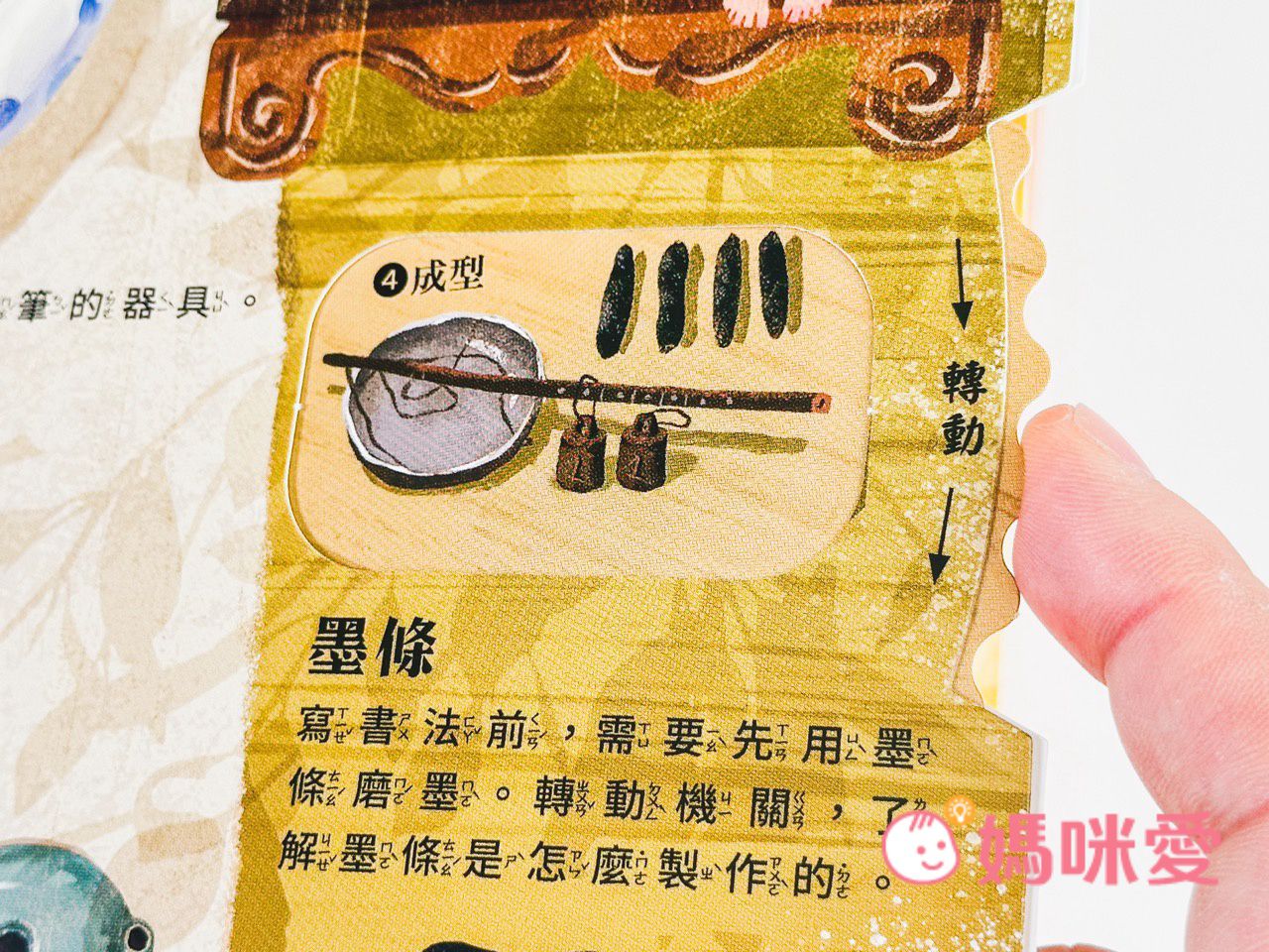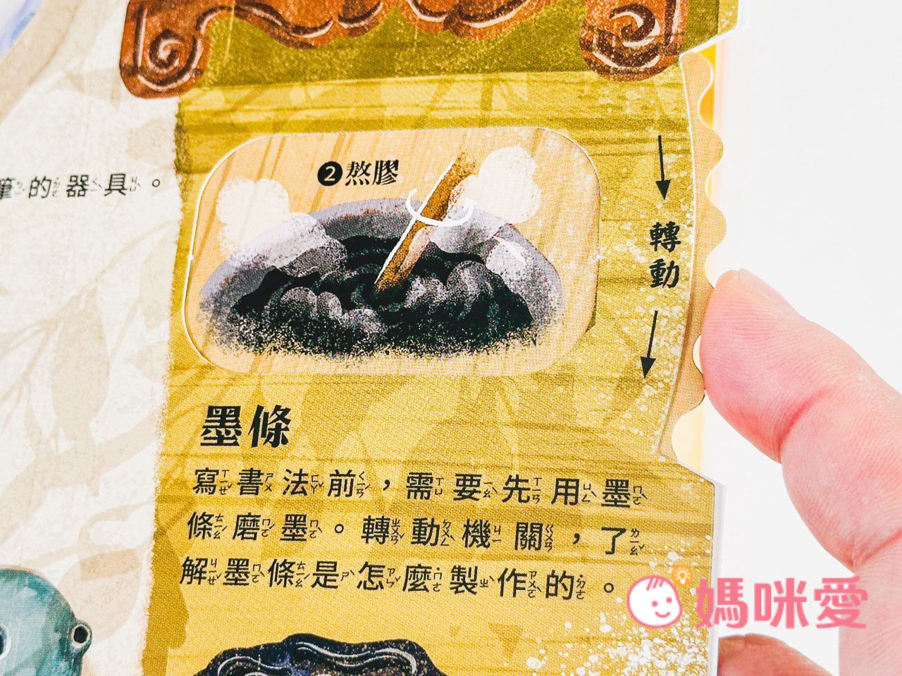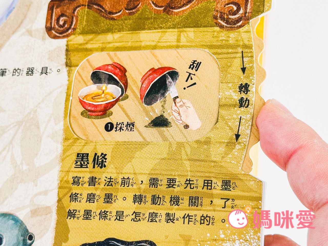 而轉動右側的機關還能了解『墨條製作的過程』~