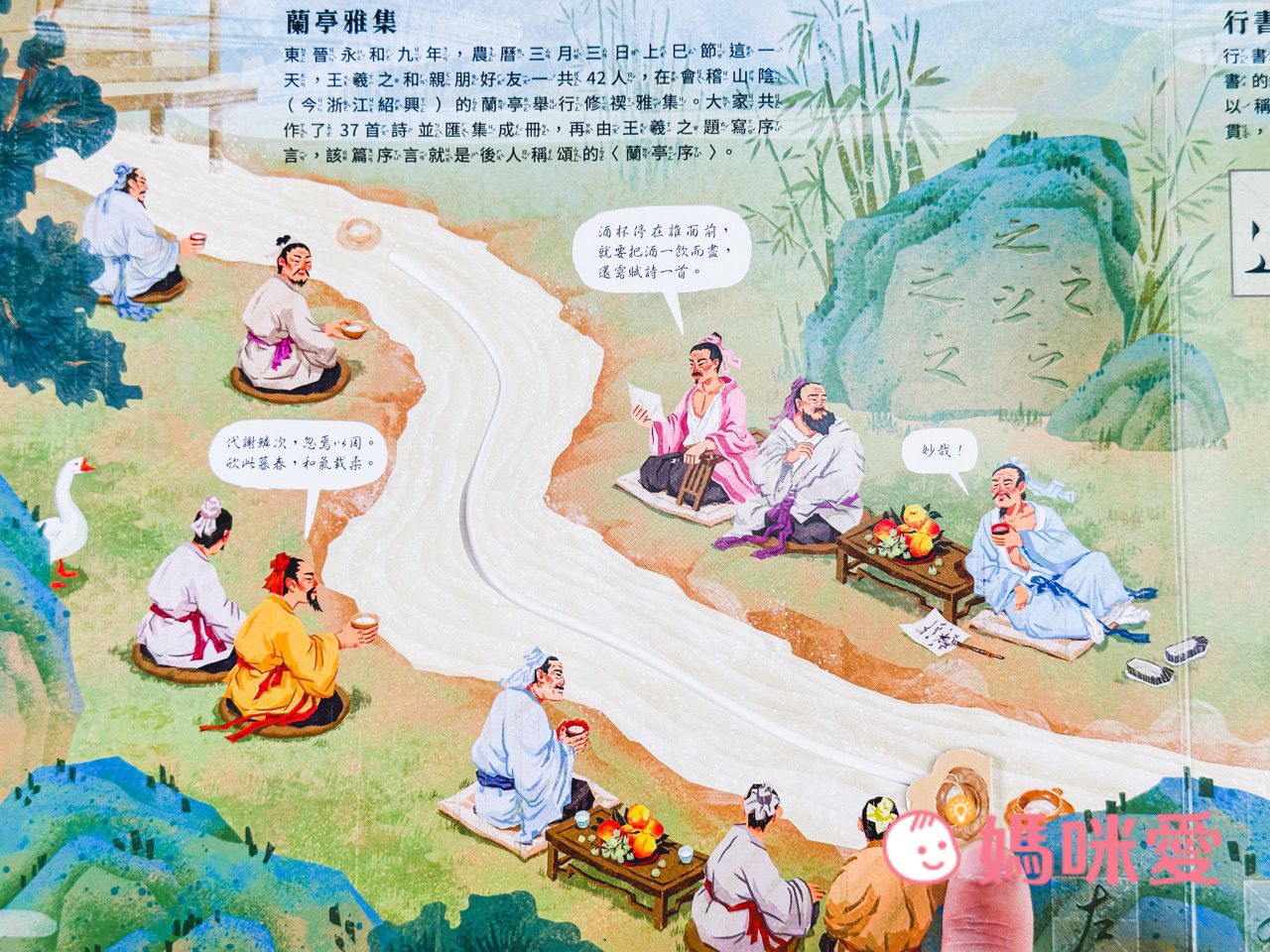 下圖為王羲之和親朋好友在會稽山的蘭亭舉行修禊雅集。共同寫作了37首詩(酒杯停在誰面前,就要乾杯,然後需賦詩一首)並匯集成冊,再由王羲之寫序言。