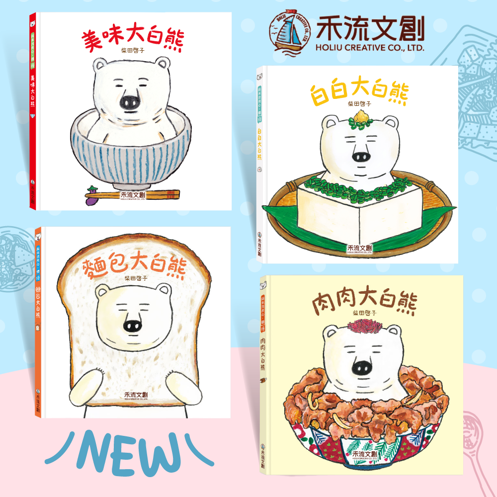 這是一隻貪吃的大白熊。喜歡吃各種肉肉料理!滋滋作響的牛排、包裹肉餡的高麗菜捲、金黃色的餃子,還有裹滿麵衣的豬排⋯如果能鑽進肉肉料理中,會是什麼感覺呢?