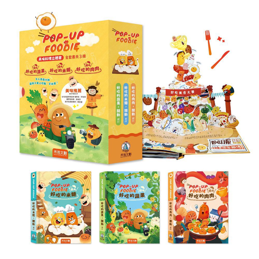 《POP-UP FOODIE》系列以蔬果類、米麵類和肉類為主題,將食物擬人化,透過呈現食物的生長過程和選用材料,啟發孩子對食物的認識,培養他們對食物的喜好和珍惜,同時解決孩子挑食的問題,促進良好的吃飯習慣。