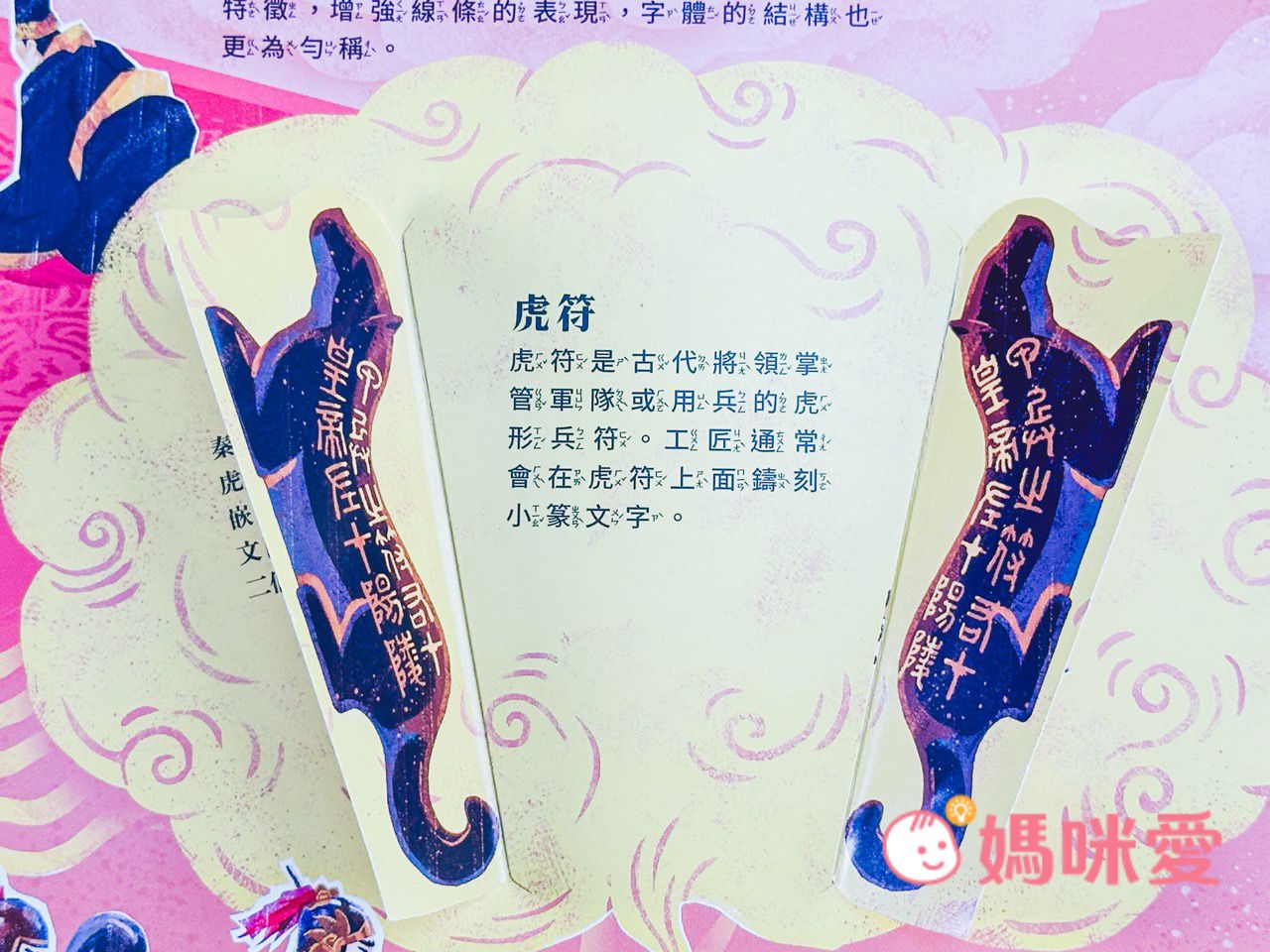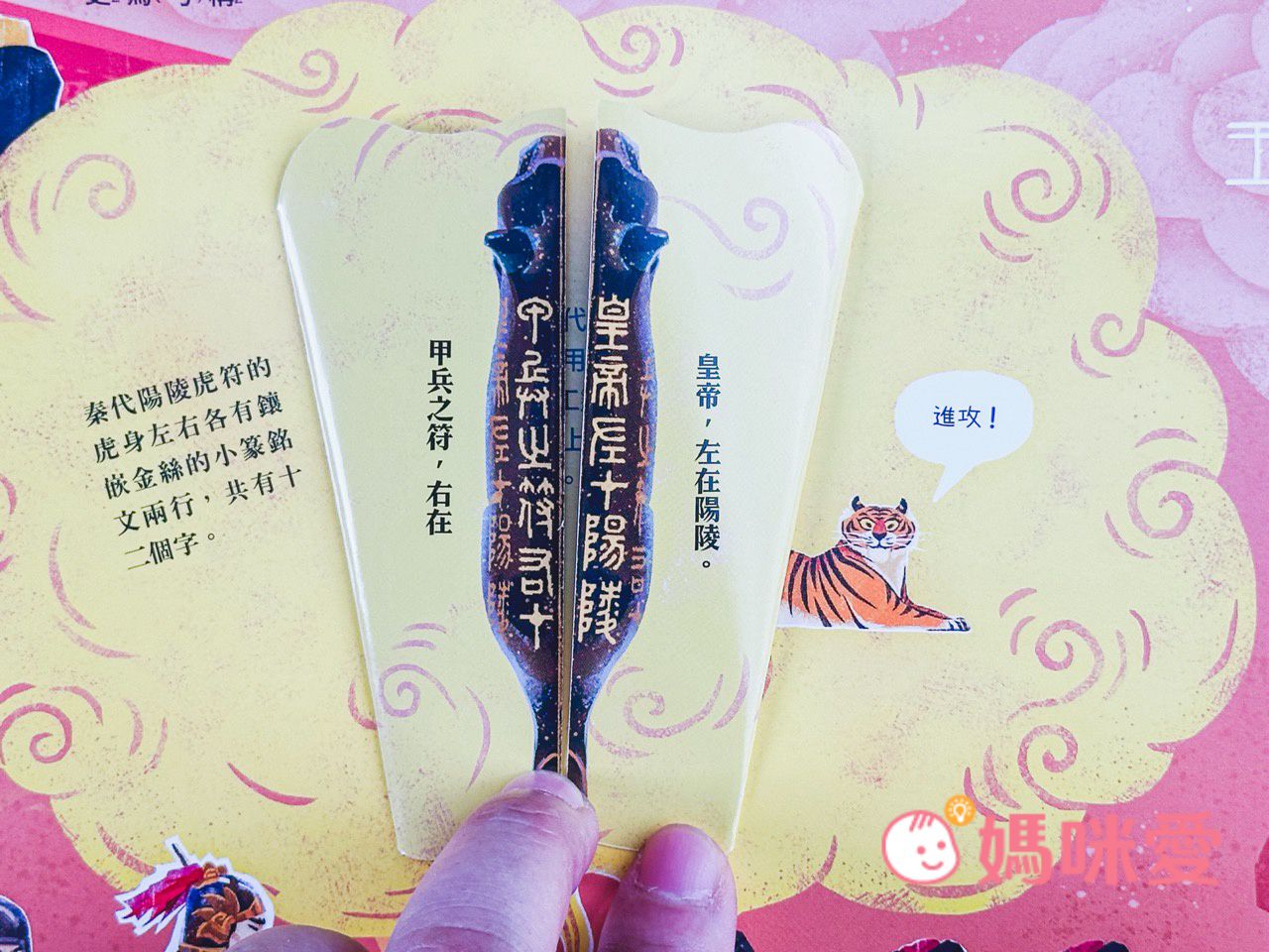 書的中間有個虎符機關。虎符是古代將領掌管軍隊或用兵的虎形兵符。工匠通常會在虎符上面鑄刻小篆文字。