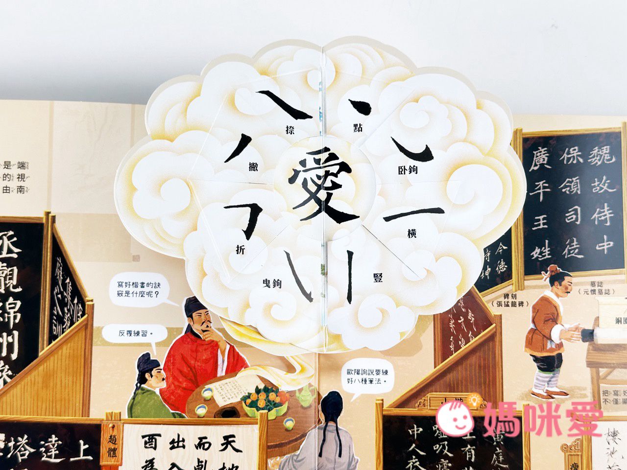 第一頁的機關就令大人小孩驚呼!畫風非常優美~有種正坐在宣紙前準備拿起毛筆寫書法的感覺。書法是一種表現漢字的書寫藝術!漢字的字體經歷多次的演變,最終形成五種字體,分別是:篆書、隸書、楷書、行書和草書。