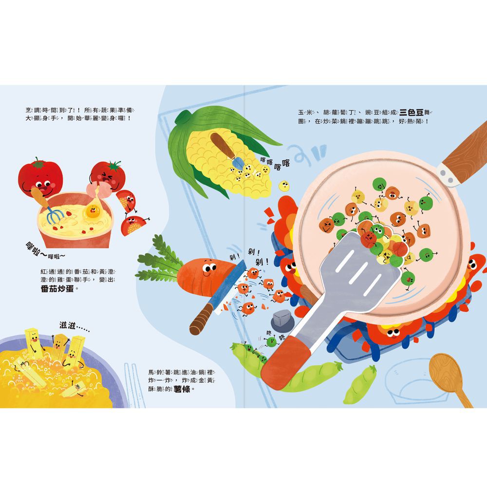 結合孩子在玩樂中學習、體會、實踐的發展規律,本系列設計4個立體大跨頁、進40個操作機關,巧妙的操作機關,讓孩子親手「製作」料理,例如炒三色豆、烤雞蛋仔、擀麵糰等,在身歷其境的互動和參與中,激發興趣!
