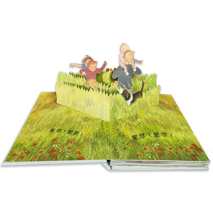 本書收錄7個立體跨頁場景,分別包含: 茂密的野草、深不見底的河水、厚厚的泥巴、黑漆漆的森林、可怕的暴風雪、看不見盡頭的洞穴,最後回到溫暖的被窩。在閱讀過程中也可以搭配內頁5個抽拉式機關,跟著故事主角們一群人展開找大熊的冒險。精彩生動的畫面能提升孩子的好奇心、刺激視覺發展,透過拉動機關鍛鍊手指肌肉、提升協調性。