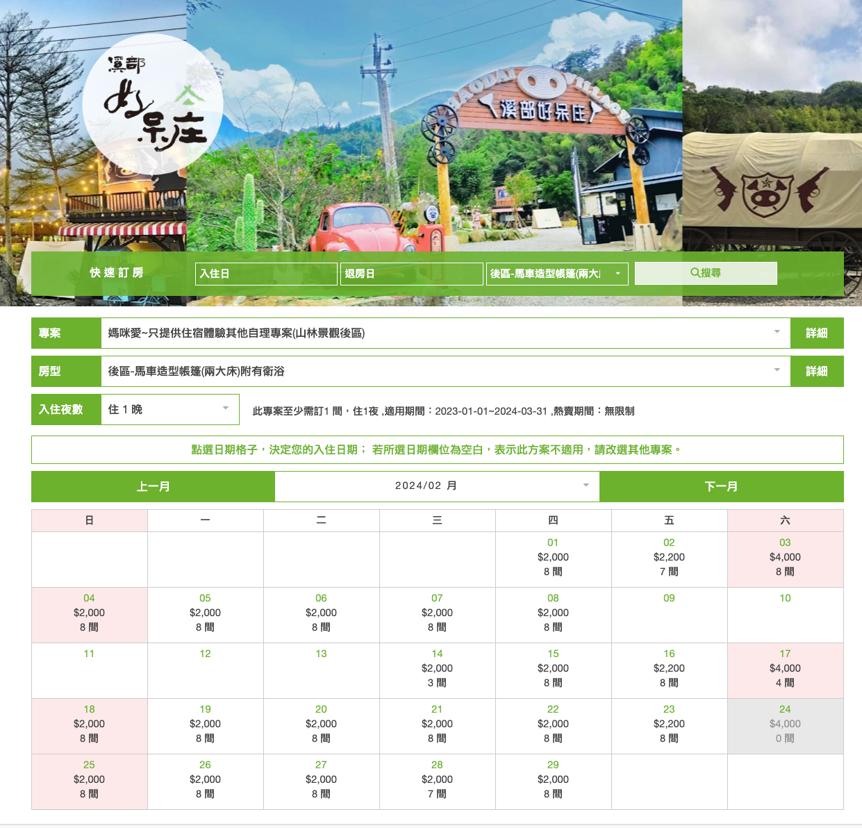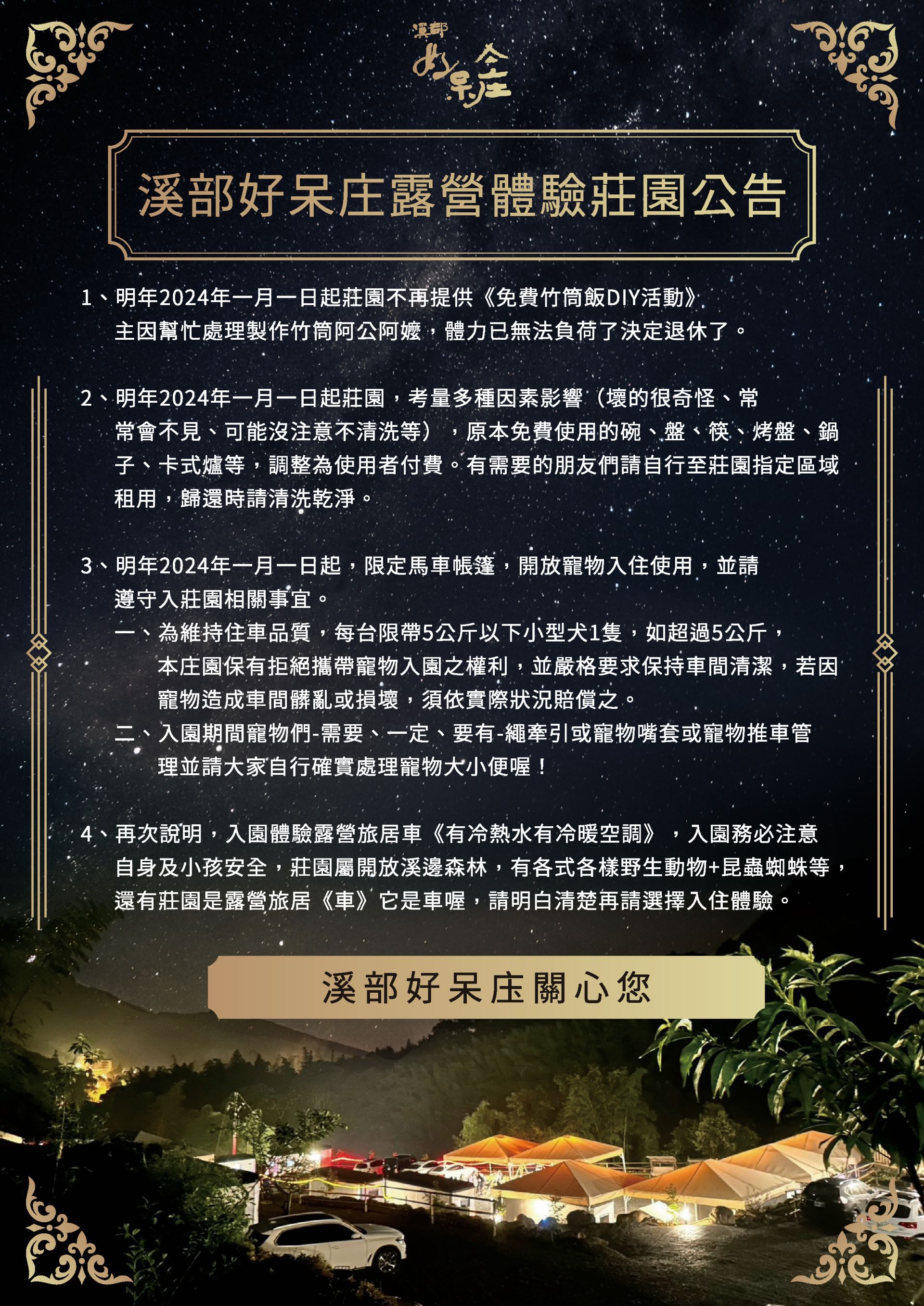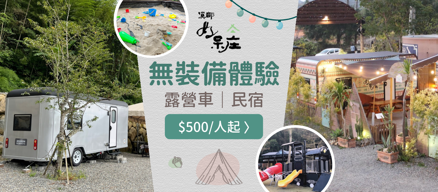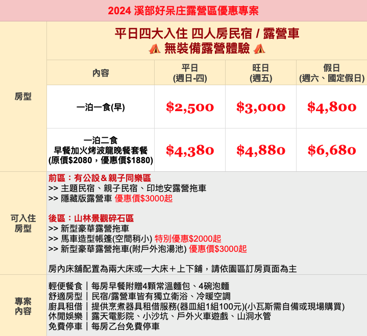 註:可入住就寢區分前區(有公設&親子同樂區、民宿/隱藏版露營車/印第安露營拖車)與後區(山林景觀碎石區、馬車造型帳篷、新型豪華露營拖車),價格將依選擇房型調整、2024農曆新年價格另計,請依訂房頁面為主。