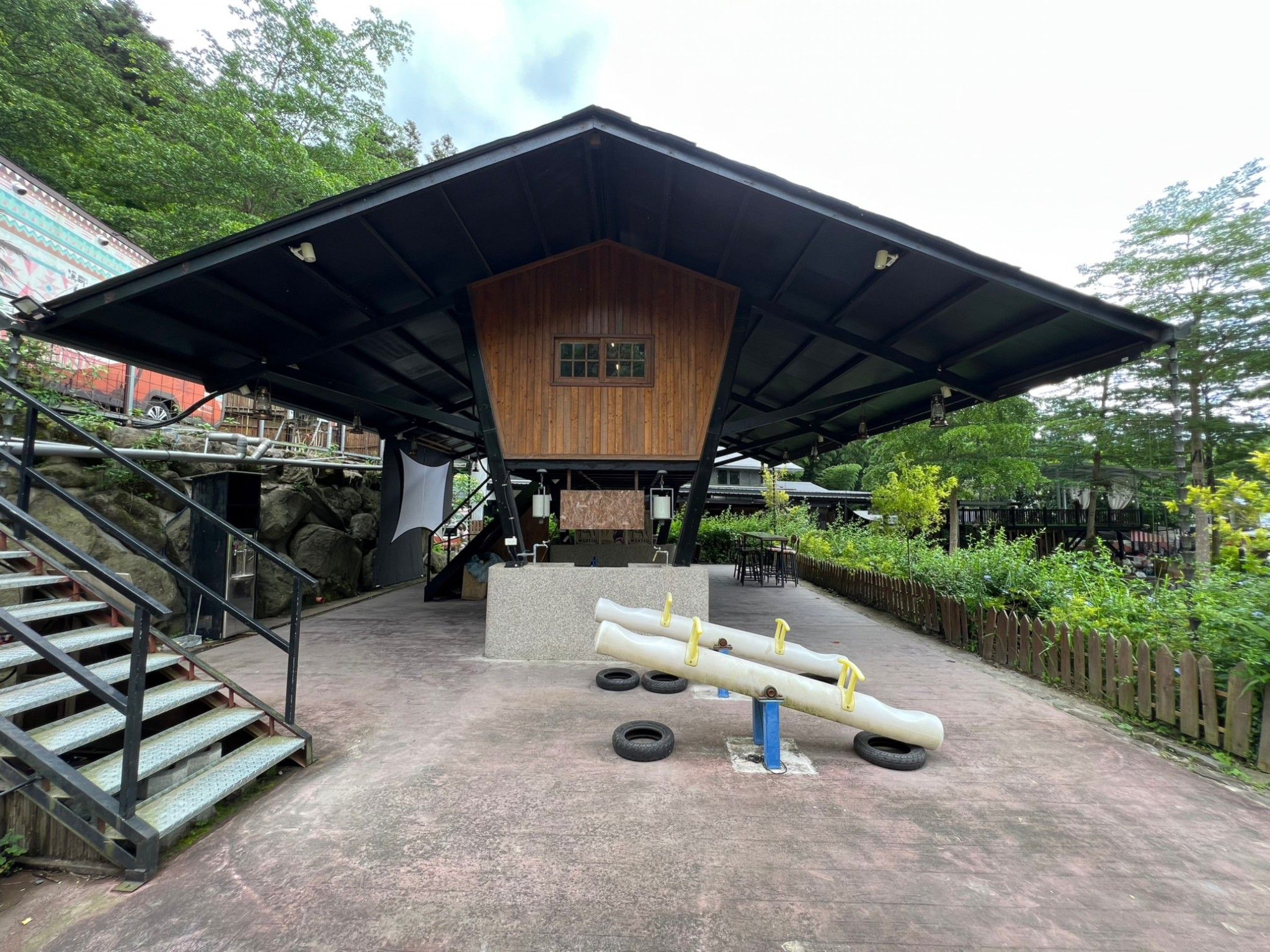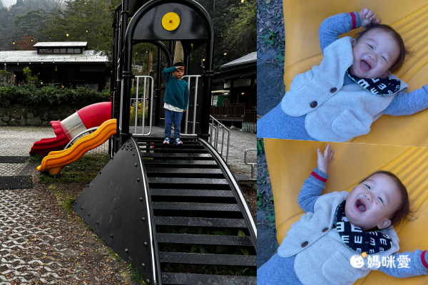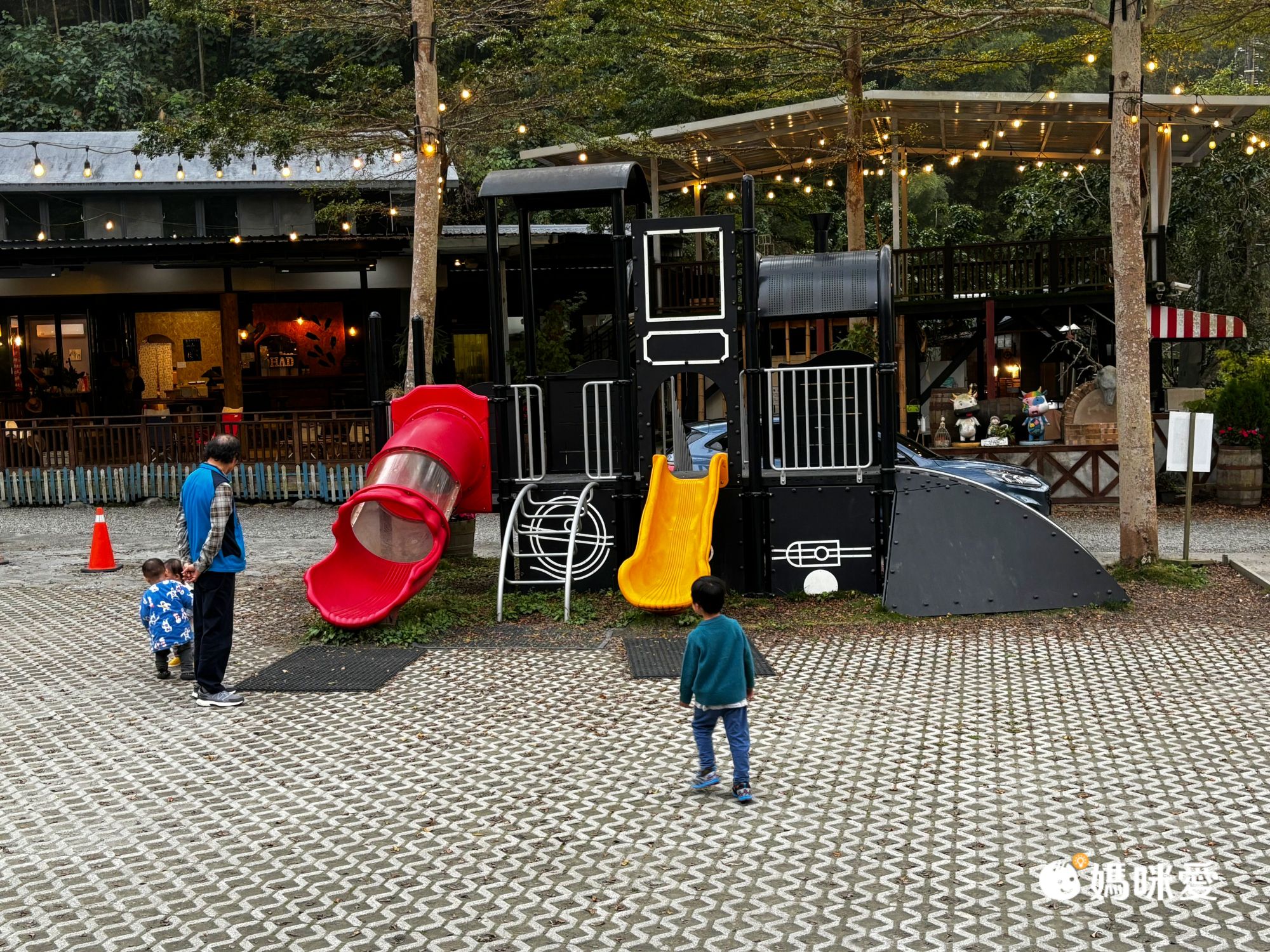 前區有小朋友遊戲區、簡單的溜滑梯設施